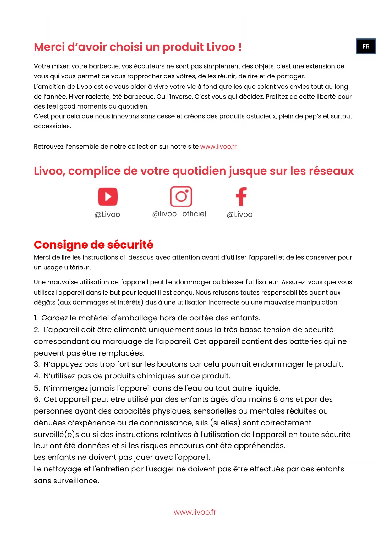 Figure 2www.livoo.fr Merci d’avoir choisi un produit Livoo ! Votre mixer, votre barbecue, vos écouteurs ne sont pas simplement des objets, c’est une extension de vous qui vous permet de vous rapprocher des vôtres, de les réunir, de rire et de partager. L’ambition de Livoo est de vous aider à vivre votre vie à fond qu’elles que soient vos envies tout au long de l’année. Hiver raclette, été barbecue. Ou l’inverse. C’est vous qui décidez. Profitez de cette liberté pour des feel good moments au quotidien. C’est pour cela que nous innovons sans cesse et créons des produits astucieux, plein de pep’s et surtout accessibles. Retrouvez l’ensemble de notre collection sur notre site www.livoo.fr Livoo, complice de votre quotidien jusque sur les réseaux