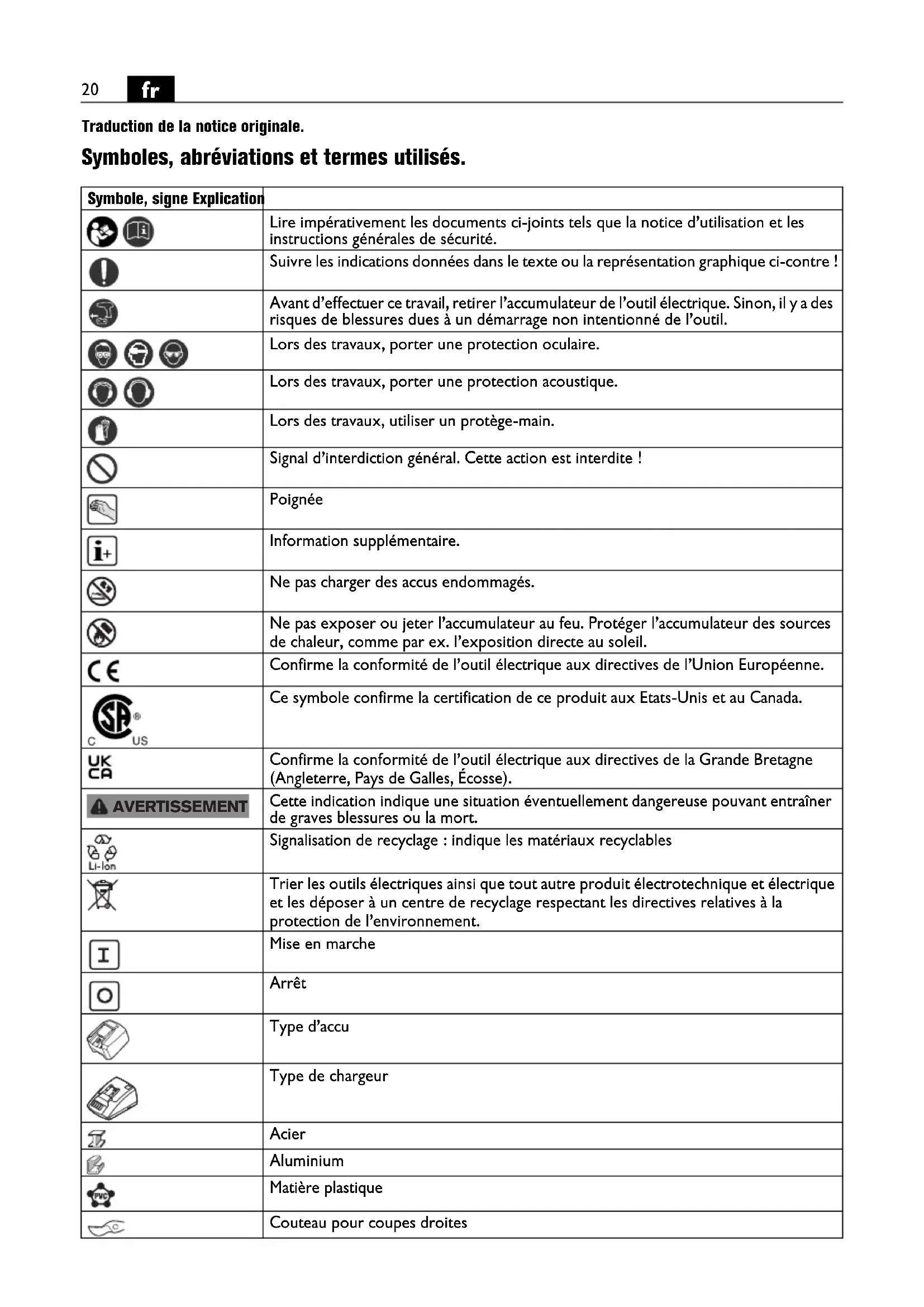 Traduction de la notice originale. Symboles, abréviations et termes utilisés. Symbole, signe Explication Lire impérativement les documents ci-joints tels que la notice d’utilisation et les instructions générales de sécurité. Suivre les indications données dans le texte ou la représentation graphique ci-contre ! Avant d’effectuer ce travail, retirer l’accumulateur de l’outil électrique. Sinon, il y a des risques de blessures dues à un démarrage non intentionné de l’outil. Lors des travaux, porter une protection oculaire. Lors des travaux, porter une protection acoustique. Lors des travaux, utiliser un protège-main. Signal d’interdiction général. Cette action est interdite ! Poignée Information supplémentaire. Ne pas charger des accus endommagés. Ne pas exposer ou jeter l’accumulateur au feu. Protéger l’accumulateur des sources de chaleur, comme par ex. l’exposition directe au soleil. Confirme la conformité de l’outil électrique aux directives de l’Union Européenne. Ce symbole confirme la certification de ce produit aux Etats-Unis et au Canada. Confirme la conformité de l’outil électrique aux directives de la Grande Bretagne (Angleterre, Pays de Galles, Écosse). Cette indication indique une situation éventuellement dangereuse pouvant entraîner de graves blessures ou la mort. Signalisation de recyclage : indique les matériaux recyclables Trier les outils électriques ainsi que tout autre produit électrotechnique et électrique et les déposer à un centre de recyclage respectant les directives relatives à la protection de l’environnement. Mise en marche Arrêt Type d’accu Type de chargeur Acier Aluminium Matière plastique Couteau pour coupes droites AVERTISSEMENT21