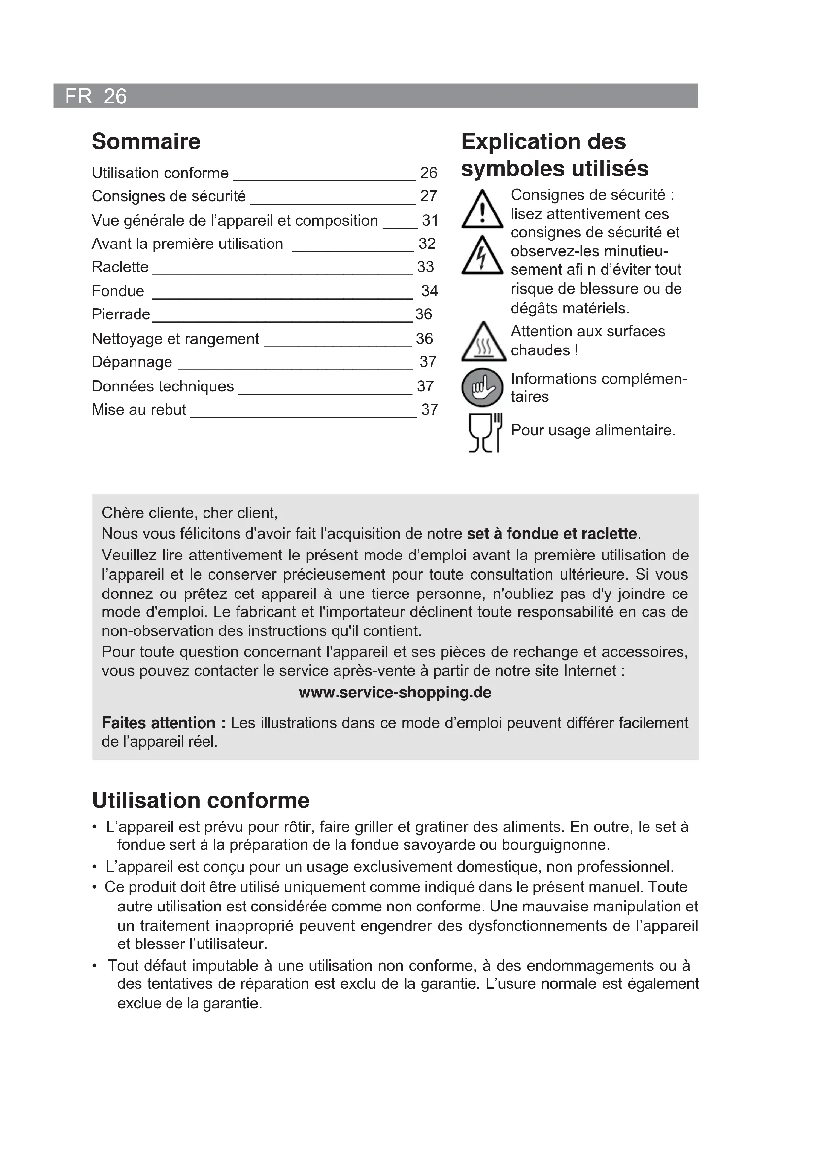 - Tout défaut imputable à une utilisation non conforme, à des endommagements ou à des tentatives de réparation est exclu de la garantie. L’usure normale est également exclue de la garantie. Sommaire Utilisation conforme _____________________ 26 Consignes de sécurité ___________________ 27 Vue générale de l’appareil et composition ____ 31 Avant la première utilisation ______________ 32 Raclette ______________________________ 33 Fondue ______________________________ 34 Pierrade ______________________________ 36 Nettoyage et rangement _________________ 36 Dépannage ___________________________ 37 Données techniques ____________________ 37 Mise au rebut __________________________ 37 Explication des symboles utilisés Consignes de sécurité : lisez attentivement ces consignes de sécurité et observez-les minutieu- sement afi n d’éviter tout risque de blessure ou de dégâts matériels. Attention aux surfaces chaudes ! Informations complémen- taires Pour usage alimentaire.27 FR Consignes de sécurité ■ Cet appareil peut être utilisé par les enfants à partir de 8 ans et les personnes dont les capacités physiques, sensorielles ou mentales sont réduites ou manquant d’expérience et/ou de connaissances lorsqu’elles sont sous surveillance ou qu’elles ont été instruites quant à l’utilisation de l’appareil en toute sécurité et qu’elles ont compris les risques en découlant. ■ Les enfants ne doivent pas jouer avec l’appareil. ■ Le nettoyage et l’entretien utilisateur ne doivent pas être réali- sés par les enfants sauf s’ils ont plus de 8 ans et qu’ils sont sous surveillance. ■ Tenez l’appareil et son cordon d’alimentation hors de portée des animaux et des enfants de moins de 8 ans. Attention aux surfaces chaudes ! À l’utilisation, l’appareil devient très chaud. Veillez impérativement à ne pas entrer en contact avec des parties chaudes pendant ou après l’utilisation de l’appareil. Lorsque l’appareil fonctionne ou immédiatement après l’avoir arrêté, seules les poignées et le thermostat peuvent être saisies à mains nues. Nous recommandons d’utiliser des maniques pour manipuler l’appareil. ■ L’appareil doit toujours être débranché du secteur lorsqu’il n’est pas sous surveillance, avant d’être assemblé, démonté ou nettoyé. ■ Ne procédez à aucune modifi cation sur l’appareil. Ne remplacez pas vous-même le cordon d’alimentation. Si l’appareil lui-même, son cordon d’alimentation ou sa fi che sont endommagés, c’est au fabricant, au service après-vente ou à toute personne aux qualifi cations similaires (par ex. un atelier spécialisé) qu’il revient de le réparer afi n d’éviter tout danger. ■ L’appareil n’est pas conçu pour une utilisation avec un minuteur auxiliaire ou un système de commande à distance externe. ■ ATTENTION : respectez les consignes de nettoyage données au paragraphe « Nettoyage et rangement » !FR 28 Risques de blessure ■ Ne laissez pas l’appareil et son emballage à la portée des enfants ou des animaux. Ils risqueraient de se blesser et de s’étouffer avec ! ■ ATTENTION Risque de brûlures ! Manipulez l’appareil avec prudence lorsque le poêlon à fondue est rempli d’huile chaude ou de fromage chaud ! Ne versez jamais d’eau sur de l’huile chaude ou d’autres matières grasses ! ■ Veillez à ce que le poêlon à fondue ou la pierrade soit bien calé dans les évidements de la plaque à raclette prévus à cet effet. ■ Afi n que personne ne risque de trébucher, veillez à ce que le cordon d’alimentation branché ne gêne pas le passage. Le cordon ne doit pas pendre de la surface d’appui pour ne pas risquer d’entraîner l’appareil et de le faire tomber. ■ Laissez l’appareil suffi samment refroidir avant de le nettoyer et/ou de le ranger. Risque d’électrocution et risque d’incendie ■ Utilisez l’appareil uniquement dans une pièce fermée. ■ Placez toujours l’appareil avec un espace libre suffi sant tout autour et au-dessus afi n d’éviter toute accumulation de chaleur. ■ Branchez l’appareil uniquement sur une prise installée de façon réglementaire et mise à la terre. La prise doit rester facilement accessible même après le branchement de sorte à pouvoir rapidement couper l’alimentation de l’appareil. La tension du secteur doit correspondre aux caractéristiques techniques de l’appareil. Utilisez uniquement des rallonges conformes dont les caractéristiques techniques correspondent à celles de l’appareil. ■ Ne plongez jamais l’appareil, le cordon d’alimentation et la fi che dans l’eau ou tout autre liquide et assurez-vous qu’ils ne risquent pas de tomber dans l’eau ou d’être mouillés. ■ Si l’appareil tombe dans l’eau, coupez immédiatement l’alimentation électrique. N’essayez pas de le sortir de l’eau tant qu’il est encore raccordé au réseau électrique ! ■ N’utilisez pas l’appareil en cas de dysfonctionnement, s’il est tombé par terre ou encore dans l’eau. Avant toute remise en service, faites-le contrôler dans un atelier spécialisé. ■ Ne saisissez jamais l’appareil, le cordon d’alimentation et la fi che à mains humides lorsque ces composants sont raccordés au réseau électrique. ■ Arrêtez l’appareil et retirez la fi che de la prise de courant si un dysfonctionnement survient au cours de l’utilisation ou en cas d’orage. ■ Pour débrancher l’appareil, tirez toujours sur la fi che, jamais sur le cordon d’alimentation électrique. ■ Placez toujours en premier le logement recevant le poêlon à fondue dans la plaque de cuisson de la raclette avant de poser le poêlon sur l’appareil à raclette (voir chapitres « Raclette » et « Fondue »). Sans ce logement, la stabilité du poêlon ne saurait être garantie. ■ N’utilisez pas l’appareil dans des locaux renfermant des poussières facilement infl ammabl