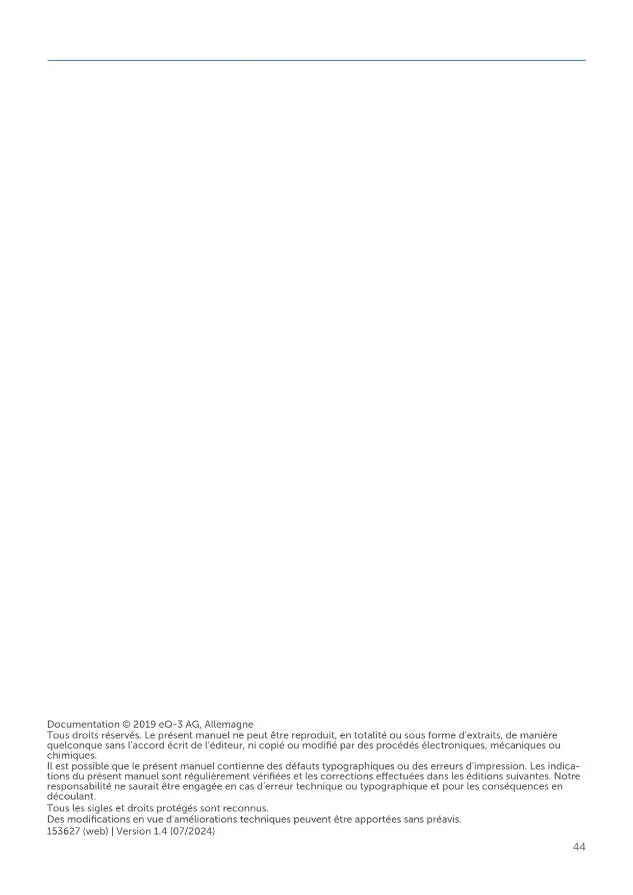 - 16 Caractéristiques techniques Documentation © 2019 eQ-3 AG, Allemagne Tous droits réservés. Le présent manuel ne peut être reproduit, en totalité ou sous forme d’extraits, de manière quelconque sans l’accord écrit de l’éditeur, ni copié ou modifié par des procédés électroniques, mécaniques ou chimiques. Il est possible que le présent manuel contienne des défauts typographiques ou des erreurs d’impression. Les indica- tions du présent manuel sont régulièrement vérifiées et les corrections eectuées dans les éditions suivantes. Notre responsabilité ne saurait être engagée en cas d’erreur technique ou typographique et pour les conséquences en découlant. Tous les sigles et droits protégés sont reconnus. Des modifications en vue d'améliorations techniques peuvent être apportées sans préavis. 153627 (web) | Version 1.4 (07/2024)45 Contenu de la livraison 1 Contenu de la livraison p. 6444