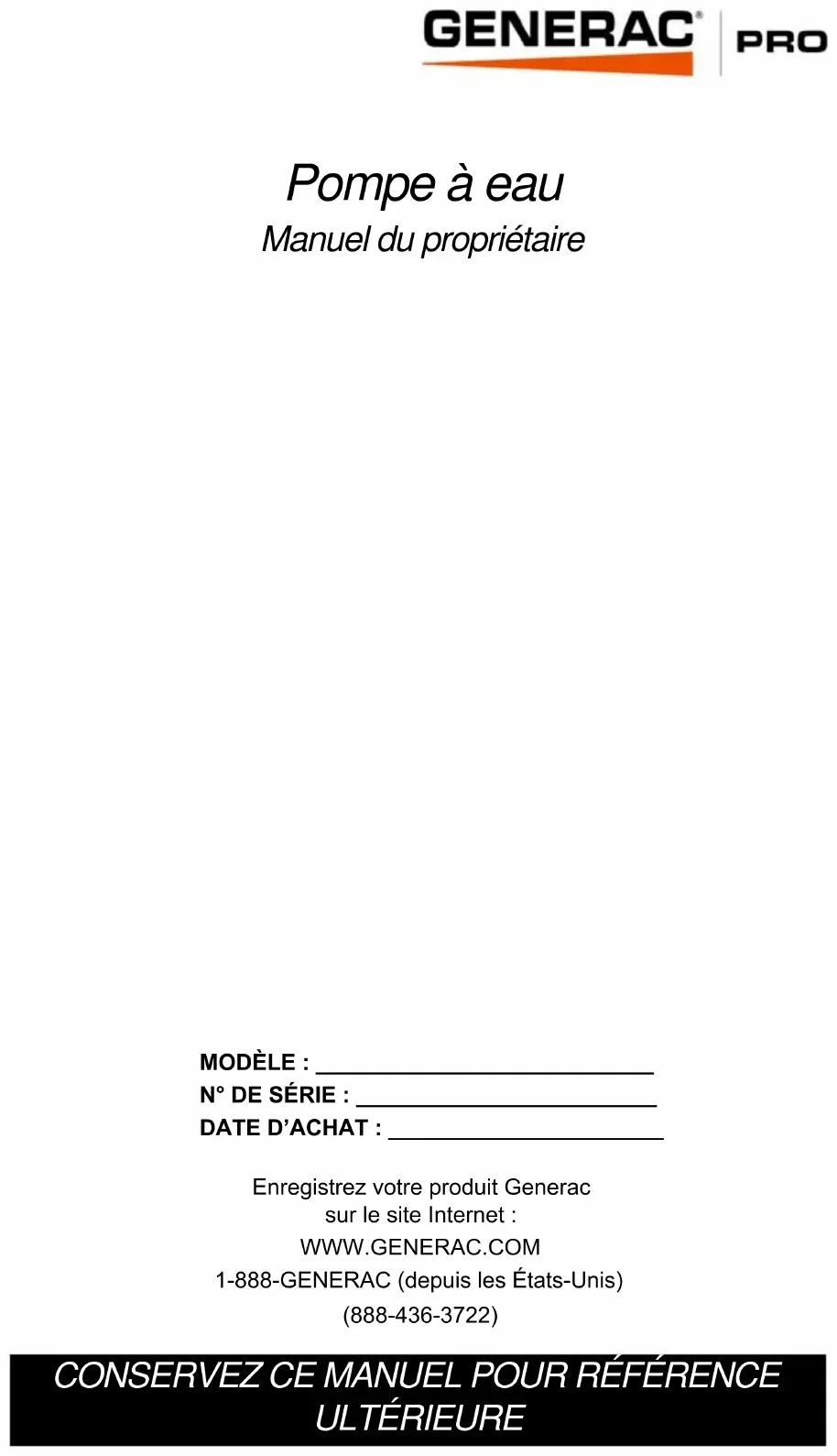Introduction Merci d’avoir acheté ce produit Generac Power Systems, Inc. Cet appareil a été conçu pour offrir un fonctionnement optimal avec des performances élevées pendant de nom- breuses années, sous réserve du respect des procédures de maintenance. Si vous n’avez pas la certitude d’avoir bien compris une quelconque partie de ce manuel, communiquez avec le concessionnaire répa- rateur indépendant agréé (CRIA) le plus proche, ou bien le Service client de Generac au 1-888-GENERAC (1-888-436-3722) ou sur www.generac.com, qui seront ravis de vous aider. Il relève de la responsabilité du propriétaire d’utiliser et d’entretenir cet équipement de façon sécurisée et adéquate. Avant d’utiliser, de réparer ou d’entreposer cette pompe à eau :