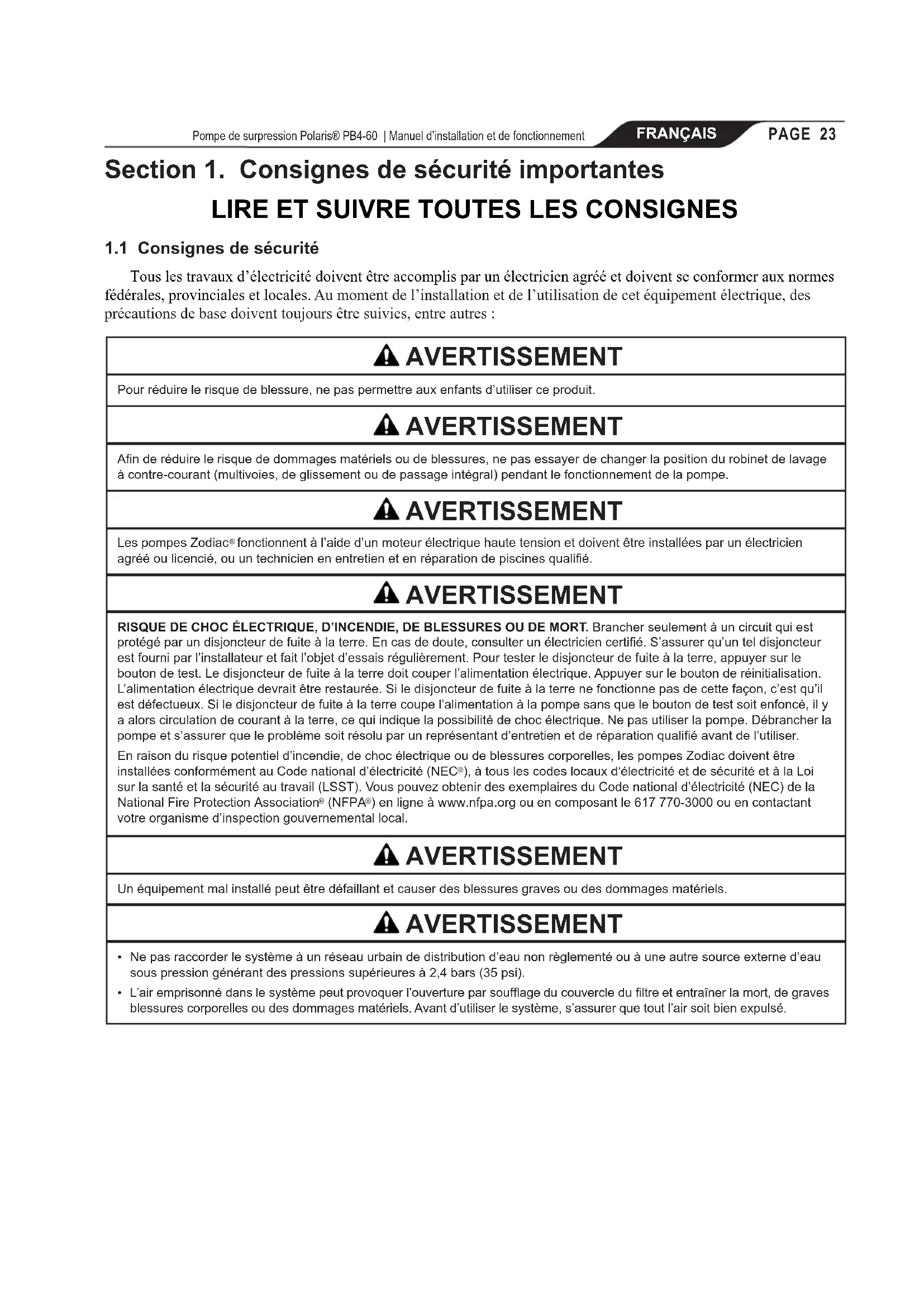 surpression pour nettoyeur haute pression Manuel d’installation et de fonctionnement POUR VOTRE SÉCURITÉ – L’installation et l’entretien de ce produit doivent être effectués par un technicien autorisé et qualié pour la réparation des équipements de piscine par les autorités compétentes du territoire dans lequel ledit produit est installé lorsque de telles exigences locales ou provinciales sont édictées. Si aucune exigence locale, provinciale ou territoriale n’est disponible, l’agent d’entretien doit être un professionnel avec sufsamment d’expérience dans l’installation et la maintenance d’équipement de piscine pour appliquer correctement les consignes du présent manuel. Une installation ou utilisation incorrecte peut causer de dangereux risques électriques pouvant provoquer le passage de courants haute tension dans le système électrique. Avant d’installer ce produit, veuillez lire et suivre toutes les consignes de mise en garde et les instructions incluses avec ce produit. Le non-respect des avertissements et des instructions pourrait causer des dommages matériels, des blessures graves ou même un décès. L’installation ou l’utilisation inappropriée annuleront la garantie. Si ces consignes ne sont pas suivies à la lettre, un incendie ou une explosion pourrait survenir causant des dommages matériels, des blessures ou un décès. À L’ATTENTION DE L’INSTALLATEUR : Le présent manuel contient des renseignements importants sur l’installation, le fonctionnement et l’utilisation dans risque de ce produit. Ces renseignements doivent être donnés au propriétaire ou à l’utilisateur de cet appareil. AVERTISSEMENT H0344400 REVD Pour les pompes de surpression Polaris PB4-60 dont les numéros de série commencent par « PB », fabriquées le 1er décembre 2011 ou postérieurement.PAGE 22 FRANÇAIS Pompe de surpression Polaris® PB4-60 | Manuel d’installation et de fonctionnement Table des matières
