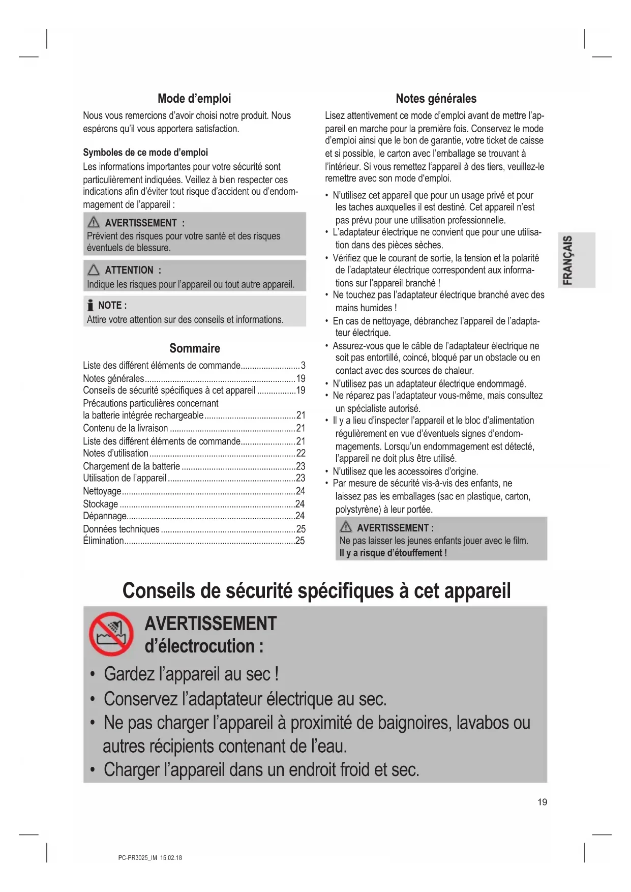 - N’utilisez pas un adaptateur électrique autre que celui fourni.PC-PR3025_IM 15.02.18