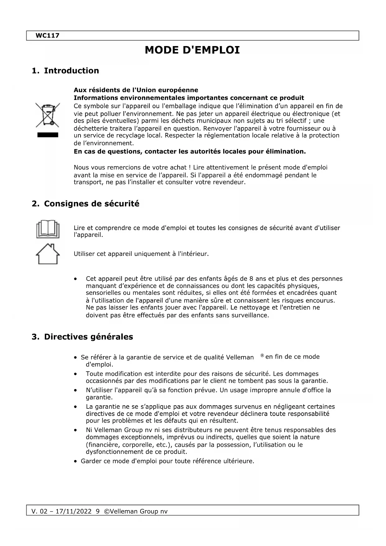Velleman Group nv est l’ayant droit des droits d’auteur de ce mode d'emploi. Tous droits mondiaux réservés. Toute reproduction, traduction, copie ou diffusion, intégrale ou partielle, du contenu de ce mode d'emploi par quelque procédé ou sur tout support électronique que ce soit est interdite sans l’accord préalable écrit de l’ayant droit.WC117
