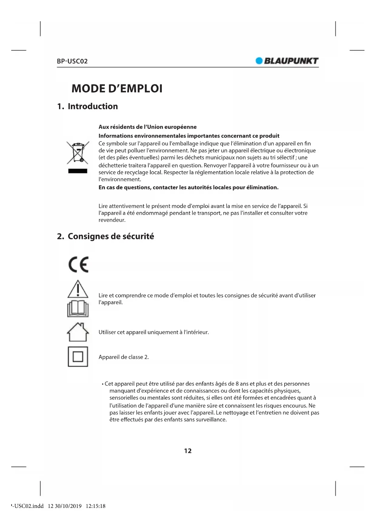 - Cet appareil peut être utilisé par des enfants âgés de 8 ans et plus et des personnes manquant d’expérience et de connaissances ou dont les capacités physiques, sensorielles ou mentales sont réduites, si elles ont été formées et encadrées quant à l’utilisation de l’appareil d’une manière sûre et connaissent les risques encourus. Ne pas laisser les enfants jouer avec l’appareil. Le nettoyage et l’entretien ne doivent pas être eectués par des enfants sans surveillance. BP-USC02.indd 12 30/10/2019 12:15:18BP-USC02