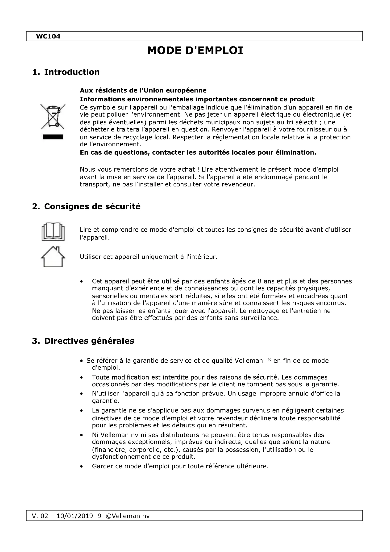 Velleman SA est l’ayant droit des droits d’auteur de ce mode d'emploi. Tous droits mondiaux réservés. Toute reproduction, traduction, copie ou diffusion, intégrale ou partielle, du contenu de ce mode d'emploi par quelque procédé ou sur tout support électronique que ce soit est interdite sans l’accord préalable écrit de l’ayant droit.WC104