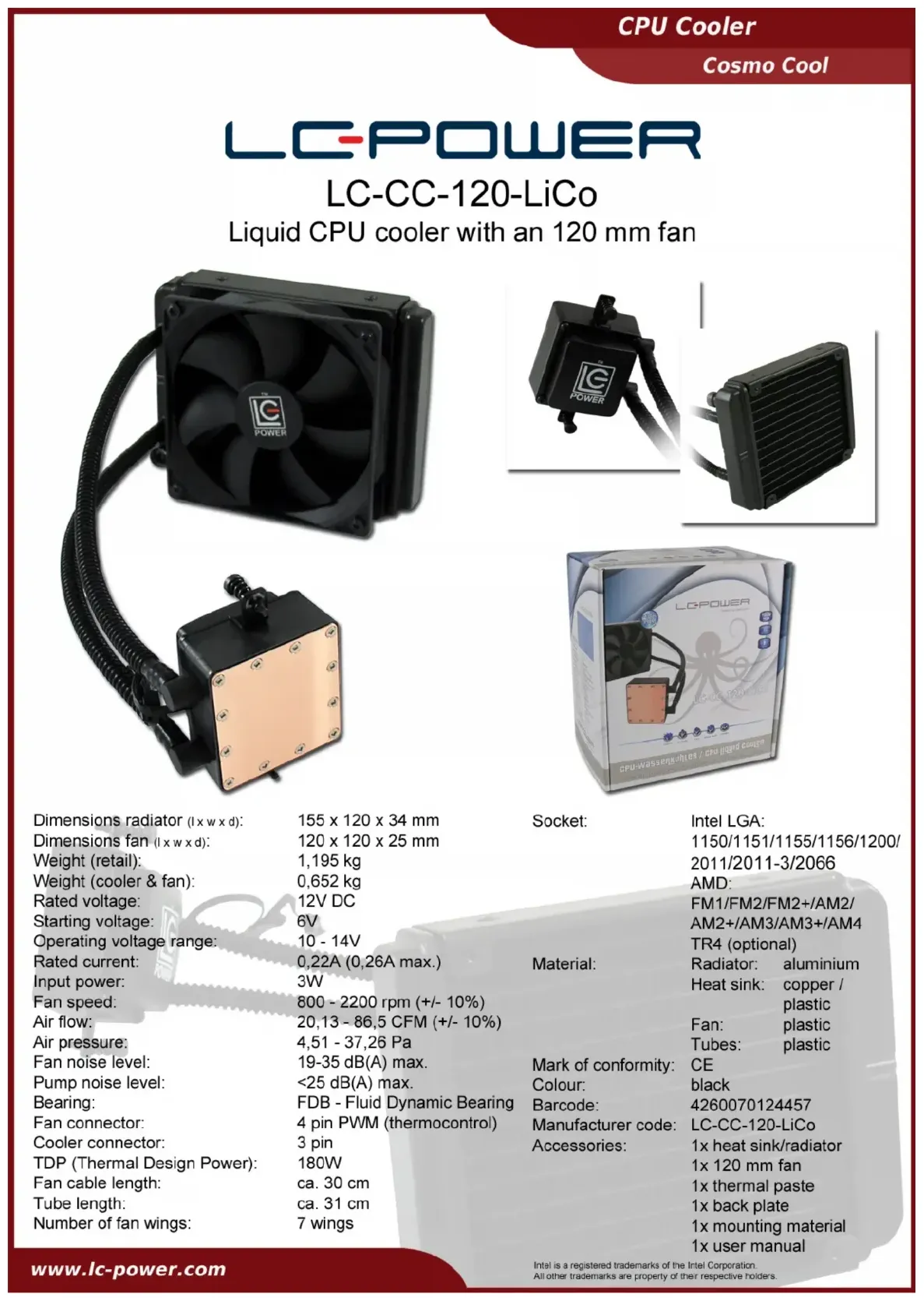 | Caractéristiques techniques | Ventirad pour processeur LC-Power CC120LiCo, compatible avec plusieurs sockets (Intel et AMD) |