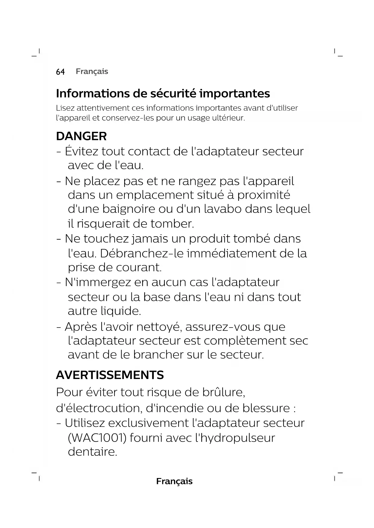 EspañolFrançais Informations de sécurité importantes Lisez attentivement ces informations importantes avant d'utiliser l'appareil et conservez-les pour un usage ultérieur. DANGER - Évitez tout contact de l'adaptateur secteur avec de l'eau. - Ne placez pas et ne rangez pas l'appareil dans un emplacement situé à proximité d'une baignoire ou d'un lavabo dans lequel il risquerait de tomber. - Ne touchez jamais un produit tombé dans l'eau. Débranchez-le immédiatement de la prise de courant. - N'immergez en aucun cas l'adaptateur secteur ou la base dans l'eau ni dans tout autre liquide. - Après l'avoir nettoyé, assurez-vous que l'adaptateur secteur est complètement sec avant de le brancher sur le secteur. AVERTISSEMENTS Pour éviter tout risque de brûlure, d'électrocution, d'incendie ou de blessure: - Utilisez exclusivement l'adaptateur secteur (WAC1001) fourni avec l'hydropulseur dentaire.