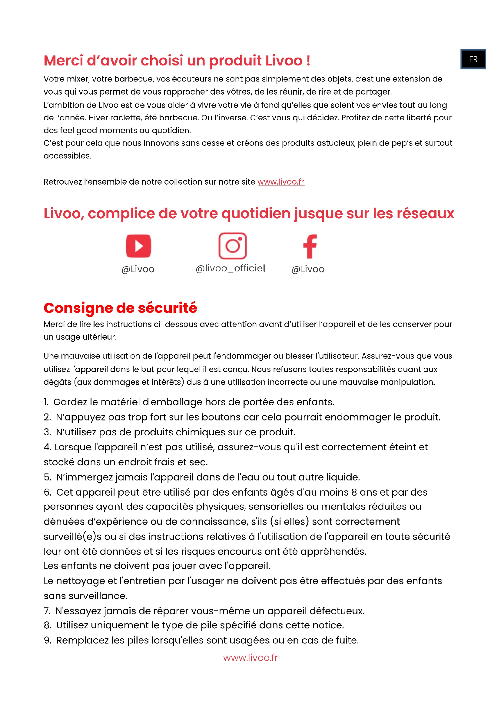 Figure 2www.livoo.fr Merci d’avoir choisi un produit Livoo ! Votre mixer, votre barbecue, vos écouteurs ne sont pas simplement des objets, c’est une extension de vous qui vous permet de vous rapprocher des vôtres, de les réunir, de rire et de partager. L’ambition de Livoo est de vous aider à vivre votre vie à fond qu’elles que soient vos envies tout au long de l’année. Hiver raclette, été barbecue. Ou l’inverse. C’est vous qui décidez. Profitez de cette liberté pour des feel good moments au quotidien. C’est pour cela que nous innovons sans cesse et créons des produits astucieux, plein de pep’s et surtout accessibles. Retrouvez l’ensemble de notre collection sur notre site www.livoo.fr Livoo, complice de votre quotidien jusque sur les réseaux