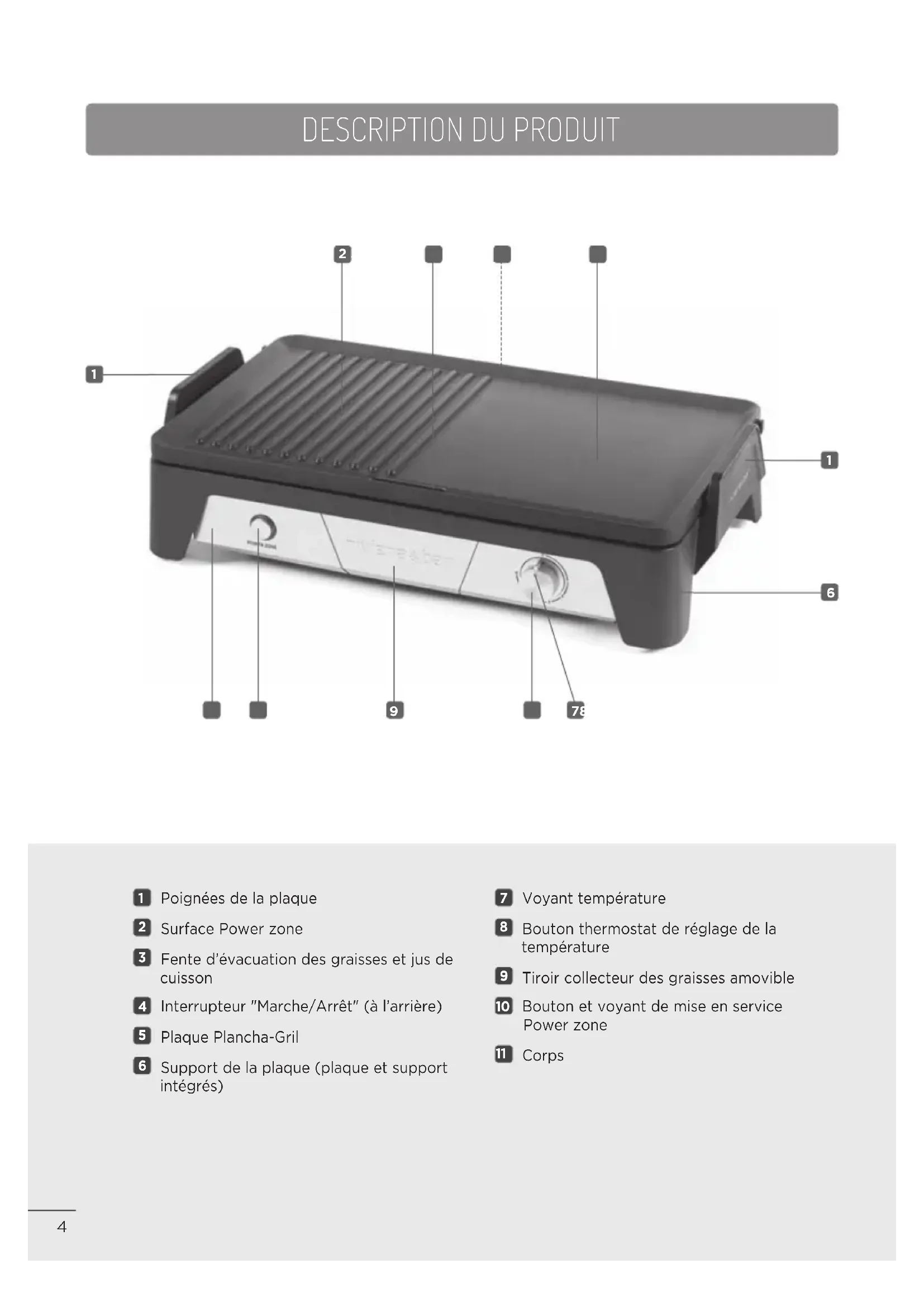 - La plaque plancha-gril devient très chaude lors de son utilisation et le reste un certain temps après em- ploi. Veiller à dégager son environnement. Veiller à utiliser des maniques pour manipuler l'appareil.