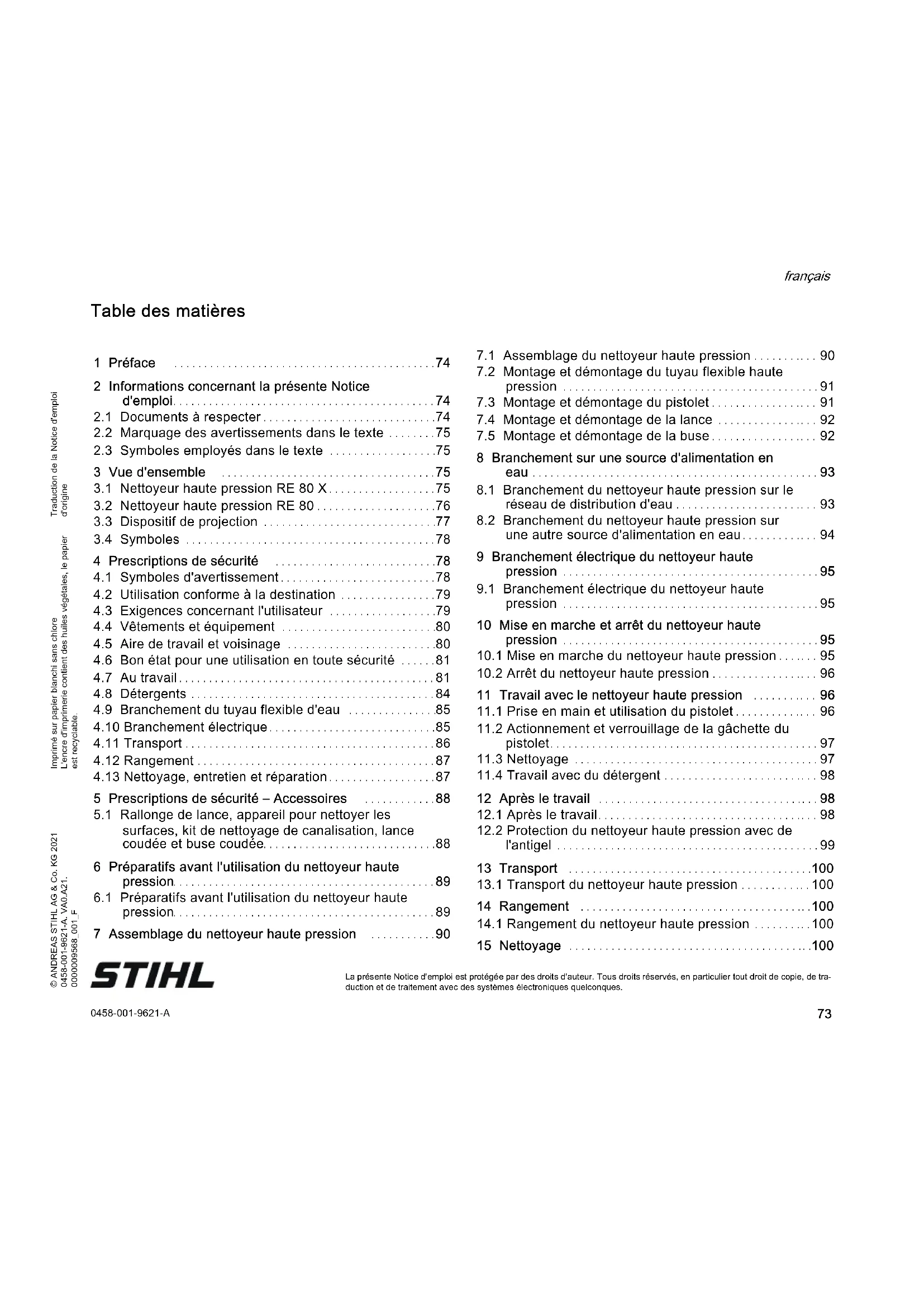 Dr. Jürgen Hoffmann, Head of Product Data, Regulations and LicensingTraduction de la Notice d'emploi d'origine Imprimé sur papier blanchi sans chlore L'encre d'imprimerie contient des huiles végétales, le papier est recyclable. © ANDREAS STIHL AG & Co. KG 2021 0458-001-9621-A. VA0.A21. 0000009568_001_F 0458-001-9621-A français