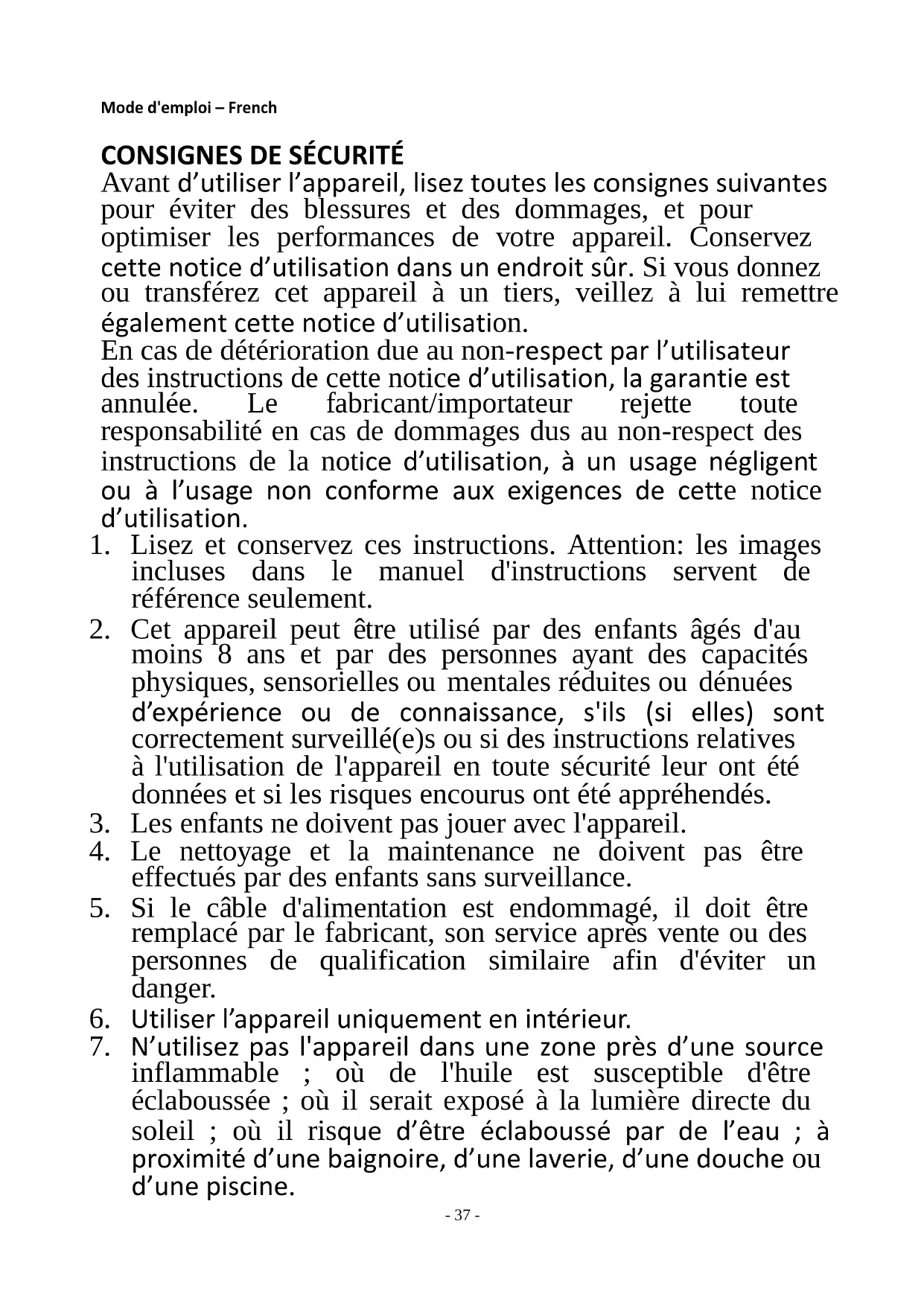 Avant d’utiliser l’appareil, lisez toutes les consignes suivantes pour éviter des blessures et des dommages, et pour optimiser les performances de votre appareil. Conservez cette notice d’utilisation dans un endroit sûr. Si vous donnez ou transférez cet appareil à un tiers, veillez à lui remettre également cette notice d’utilisation. En cas de détérioration due au non-respect par l’utilisateur des instructions de cette notice d’utilisation, la garantie est annulée. Le fabricant/importateur rejette toute responsabilité en cas de dommages dus au non-respect des instructions de la notice d’utilisation, à un usage négligent ou à l’usage non conforme aux exigences de cette notice d’utilisation.