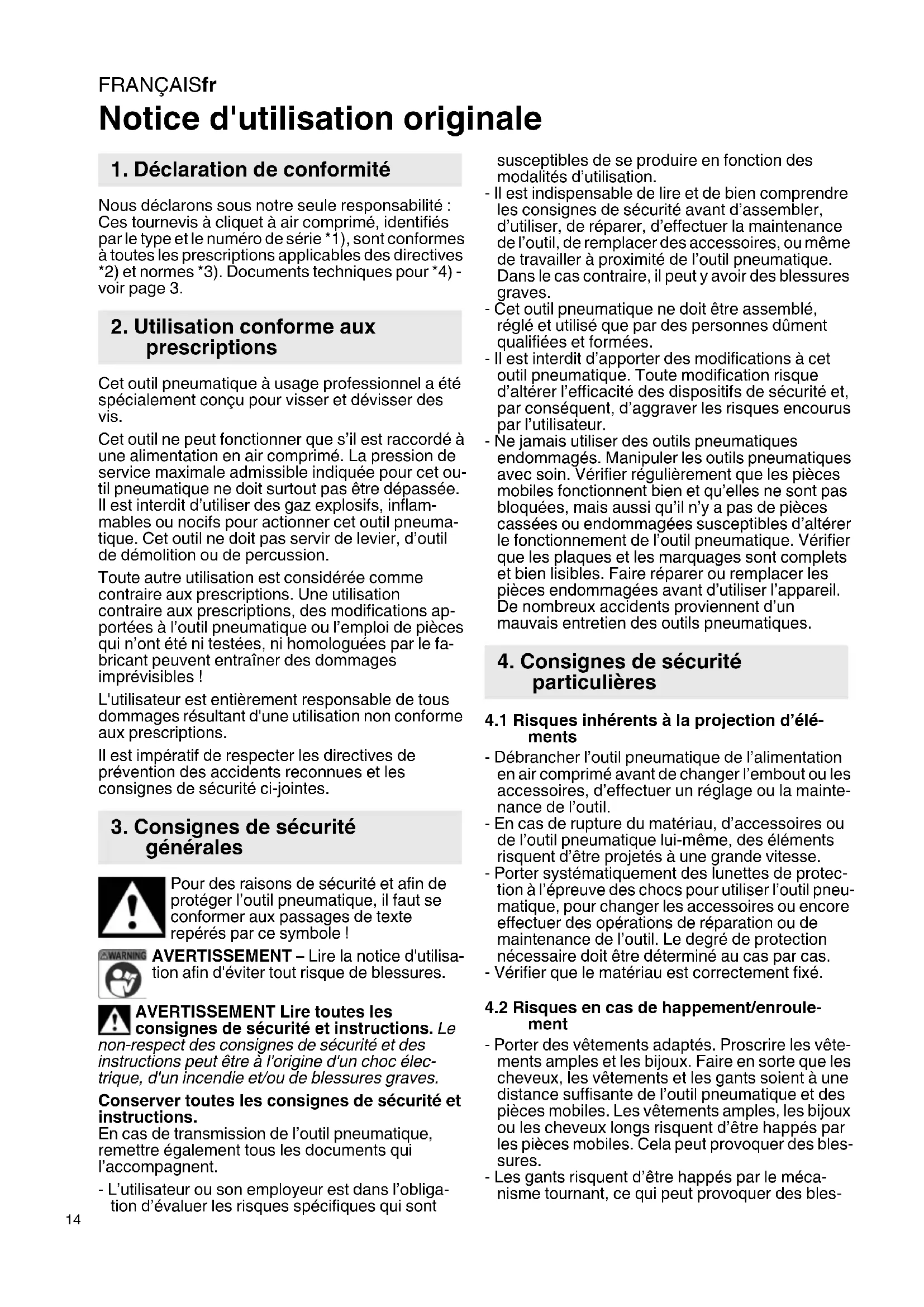 Notice d'utilisation originale Nous déclarons sous notre seule responsabilité : Ces tournevis à cliquet à air comprimé, identifiés par le type et le numéro de série *1), sont conformes à toutes les prescriptions applicables des directives *2) et normes *3). Documents techniques pour *4) - voir page 3. Cet outil pneumatique à usage professionnel a été spécialement conçu pour visser et dévisser des vis. Cet outil ne peut fonctionner que s’il est raccordé à une alimentation en air comprimé. La pression de service maximale admissible indiquée pour cet ou- til pneumatique ne doit surtout pas être dépassée. Il est interdit d’utiliser des gaz explosifs, inflam- mables ou nocifs pour actionner cet outil pneuma- tique. Cet outil ne doit pas servir de levier, d’outil de démolition ou de percussion. Toute autre utilisation est considérée comme contraire aux prescriptions. Une utilisation contraire aux prescriptions, des modifications ap- portées à l’outil pneumatique ou l’emploi de pièces qui n’ont été ni testées, ni homologuées par le fa- bricant peuvent entraîner des dommages imprévisibles ! L'utilisateur est entièrement responsable de tous dommages résultant d'une utilisation non conforme aux prescriptions. Il est impératif de respecter les directives de prévention des accidents reconnues et les consignes de sécurité ci-jointes. Pour des raisons de sécurité et afin de protéger l’outil pneumatique, il faut se conformer aux passages de texte repérés par ce symbole ! AVERTISSEMENT – Lire la notice d'utilisa- tion afin d'éviter tout risque de blessures. AVERTISSEMENT Lire toutes les consignes de sécurité et instructions. Le non-respect des consignes de sécurité et des instructions peut être à l'origine d'un choc élec- trique, d'un incendie et/ou de blessures graves. Conserver toutes les consignes de sécurité et instructions. En cas de transmission de l’outil pneumatique, remettre également tous les documents qui l’accompagnent. - L’utilisateur ou son employeur est dans l’obliga- tion d’évaluer les risques spécifiques qui sont susceptibles de se produire en fonction des modalités d’utilisation. - Il est indispensable de lire et de bien comprendre les consignes de sécurité avant d’assembler, d’utiliser, de réparer, d’effectuer la maintenance de l’outil, de remplacer des accessoires, ou même de travailler à proximité de l’outil pneumatique. Dans le cas contraire, il peut y avoir des blessures graves. - Cet outil pneumatique ne doit être assemblé, réglé et utilisé que par des personnes dûment qualifiées et formées. - Il est interdit d’apporter des modifications à cet outil pneumatique. Toute modification risque d’altérer l’efficacité des dispositifs de sécurité et, par conséquent, d’aggraver les risques encourus par l’utilisateur. - Ne jamais utiliser des outils pneumatiques endommagés. Manipuler les outils pneumatiques avec soin. Vérifier régulièrement que les pièces mobiles fonctionnent bien et qu’elles ne sont pas bloquées, mais aussi qu’il n’y a pas de pièces cassées ou endommagées susceptibles d’altérer le fonctionnement de l’outil pneumatique. Vérifier que les plaques et les marquages sont complets et bien lisibles. Faire réparer ou remplacer les pièces endommagées avant d’utiliser l’appareil. De nombreux accidents proviennent d’un mauvais entretien des outils pneumatiques.