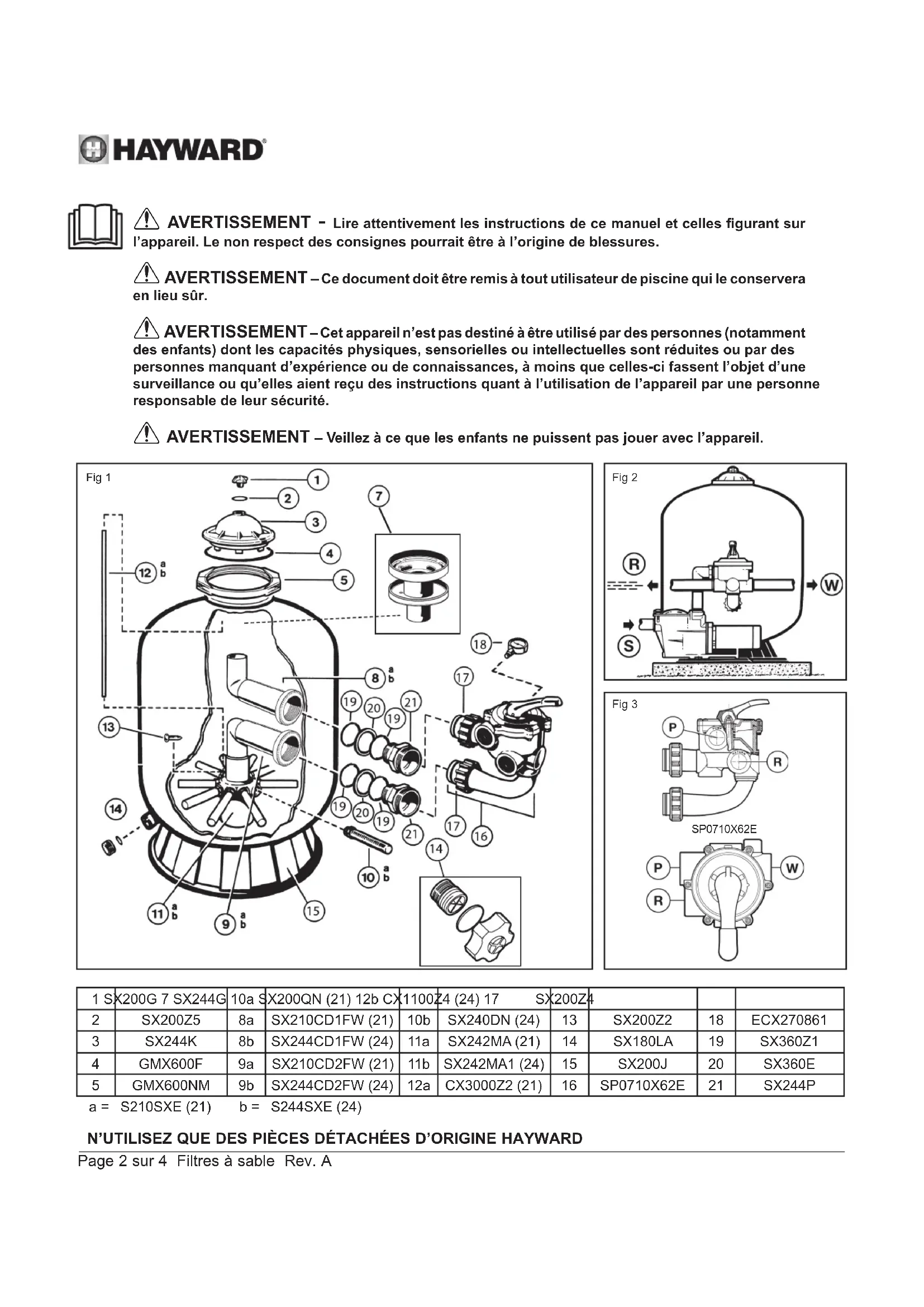 AVERTISSEMENT – Veillez à ce que les enfants ne puissent pas jouer avec l’appareil. SP0710X62E Fig 2 Fig 1 Fig 3 1 SX200G 7 SX244G 10a SX200QN (21) 12b CX1100Z4 (24) 17 SX200Z4 2 SX200Z5 8a SX210CD1FW (21) 10b SX240DN (24) 13 SX200Z2 18 ECX270861 3 SX244K 8b SX244CD1FW (24) 11a SX242MA (21) 14 SX180LA 19 SX360Z1 4 GMX600F 9a SX210CD2FW (21) 11b SX242MA1 (24) 15 SX200J 20 SX360E 5 GMX600NM 9b SX244CD2FW (24) 12a CX3000Z2 (21) 16 SP0710X62E 21 SX244P a = S210SXE (21) b = S244SXE (24)N’UTILISEZ QUE DES PIÈCES DÉTACHÉES D’ORIGINE HAYWARD Page 3 sur 4 Filtres à sable Rev. A Vous venez d’acquérir un filtre à sable, son socle et sa vanne (cf figure 1). FONCTIONNEMENT Votre filtre utilise un sable spécial destiné à retenir les saletés contenues dans l’eau de votre piscine. Le sable est versé dans la cuve et fonctionne comme un système permanent de filtration. L’eau non filtrée de la piscine, qui contient des sale- tés en suspension, est aspirée par votre pompe et envoyée vers la vanne de contrôle multi-voies. Lors du passage de l’eau à travers le sable, les impuretés sont piégées dans le lit de sable et l’eau ressort filtrée vers votre piscine. INSTALLATION