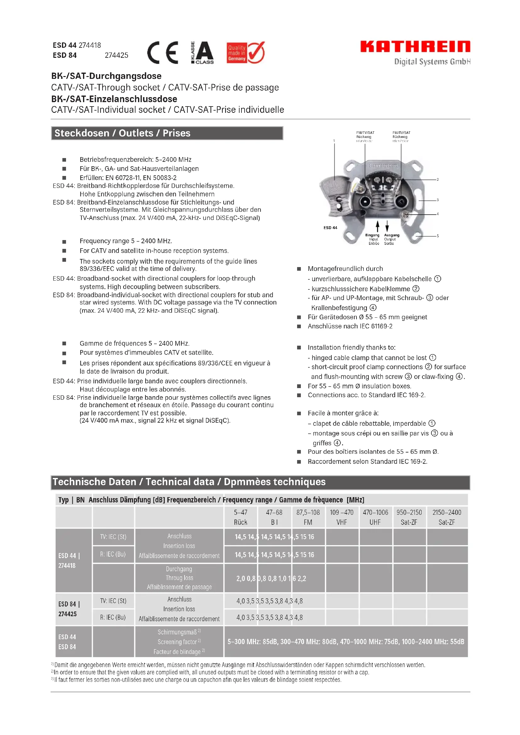 Il faut fermer les sorties non-utilisées avec une charge ou un capuchon afin que les valeurs de blindage soient respectées. ESD 44 274418 ESD 84 274425 BK-/SAT-Durchgangsdose CATV-/SAT-Through socket / CATV-SAT-Prise de passage BK-/SAT-Einzelanschlussdose CATV-/SAT-Individual socket / CATV-SAT-Prise individuelle