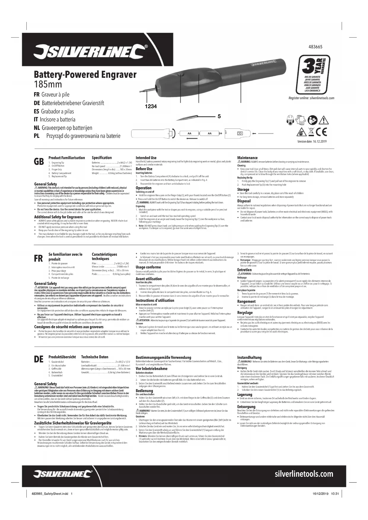 - Do not force the device. Use the correct device for your application. Thecorrectdevicewilldothejobbetterandsaferattherateforwhichitwasdesigned.Additional Safety for Engravers• ALWAYSwearsafetyglassesandsuitablerespiratoryprotectionwhenengraving.NEVERinhaledust createdwhilstengraving,itmaybeharmfuloreventoxic• DONOTapplyexcessivepressurewhenusingthistool• Keepyourhandsclearoftheengravingtipwheninuse• Themanufacturerisnotliableforanychangesmadetothetool,orforanydamageresultingfromsuch changes.Evenwhenthetoolisusedasprescribeditisnotpossibletoeliminateallresidualriskfactors General Safety ATTENTION : Cet appareil n’est pas conçu pour être utilisé par des personnes (enfants compris) ayant des capacités physiques ou mentales réduites, ou n’ayant pas la connaissance ou l’expérience requise, à moins d’être sous la supervision d’une personne responsable de leur sécurité ou d’avoir reçu les instructions nécessaires. Les enfants ne doivent pas s’approcher et jouer avec cet appareil. Veuillezconservercesinstructions etconsignesdesécuritépourréférenceultérieure.Veuillezconservercesinstructionsetconsignesdesécuritépourréférenceultérieure.