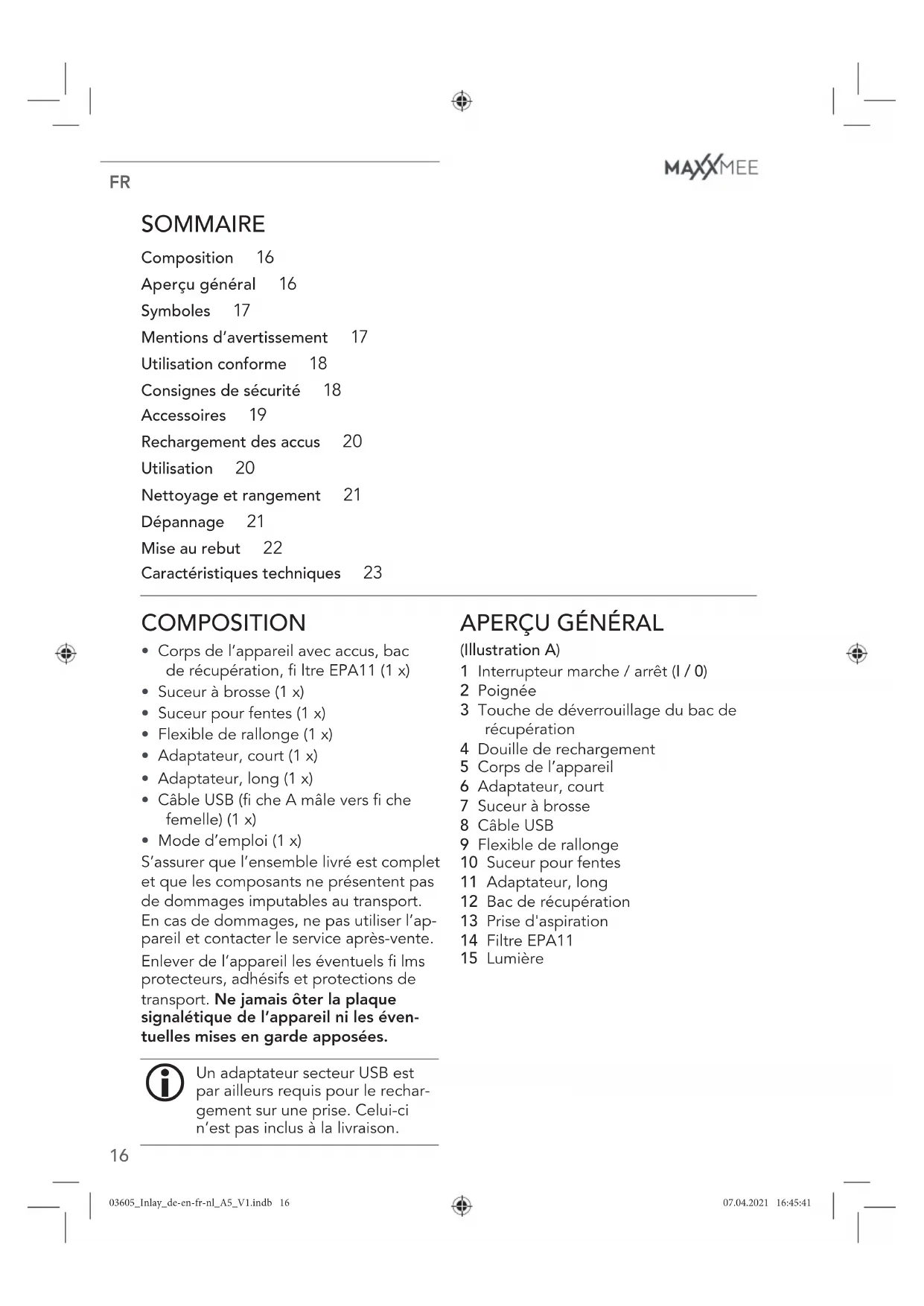 (IllustrationA) 1 Interrupteur marche/ arrêt(I / 0) 2 Poignée 3 Touche de déverrouillage du bac de récupération 4 Douille de rechargement 5 Corps de l’appareil 6 Adaptateur, court 7 Suceur à brosse 8 Câble USB 9 Flexible de rallonge 10 Suceur pour fentes 11 Adaptateur, long 12 Bac de récupération 13 Prise d'aspiration 14 Filtre EPA11 15 Lumière 03605_Inlay_de-en-fr-nl_A5_V1.indb 1603605_Inlay_de-en-fr-nl_A5_V1.indb 16 07.04.2021 16:45:4107.04.2021 16:45:41Aspirateur à main rechargeable
