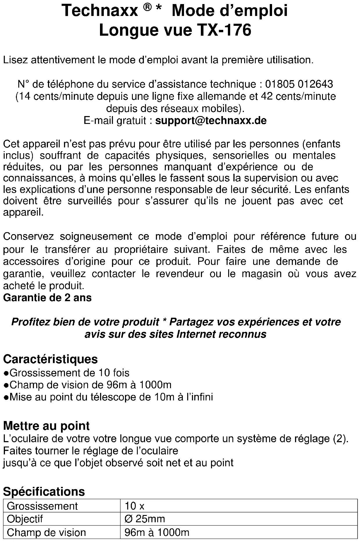 - Mode d’emploi Longue vue TX-176 Lisez attentivement le mode d’emploi avant la première utilisation. N° de téléphone du service d’assistance technique : 01805 012643 (14 cents/minute depuis une ligne fixe allemande et 42 cents/minute depuis des réseaux mobiles). E-mail gratuit : support@technaxx.de Cet appareil n’est pas prévu pour être utilisé par les personnes (enfants inclus) souffrant de capacités physiques, sensorielles ou mentales réduites, ou par les personnes manquant d’expérience ou de connaissances, à moins qu’elles le fassent sous la supervision ou avec les explications d’une personne responsable de leur sécurité. Les enfants doivent être surveillés pour s’assurer qu’ils ne jouent pas avec cet appareil. Conservez soigneusement ce mode d’emploi pour référence future ou pour le transférer au propriétaire suivant. Faites de même avec les accessoires d’origine pour ce produit. Pour faire une demande de garantie, veuillez contacter le revendeur ou le magasin où vous avez acheté le produit. Garantie de 2 ans Profitez bien de votre produit * Partagez vos expériences et votre avis sur des sites Internet reconnus Caractéristiques ●Grossissement de 10 fois ●Champ de vision de 96m à 1000m ●Mise au point du télescope de 10m à l’infini Mettre au point L’oculaire de votre votre longue vue comporte un système de réglage (2). Faites tourner le réglage de l’oculaire jusqu’à ce que l’objet observé soit net et au point Spécifications Grossissement 10 x Objectif Ø 25mm Champ de vision 96m à 1000mPoids/Dimensions 82g / Ø3,5x10,9cm Présentation générale du produit Entretien et maintenance Nettoyez le produit avec un tissu non pelucheux sec ou légèrement humide. N’utilisez pas de produits nettoyants abrasifs pour nettoyer l’unité. Cet appareil est un instrument optique de précision, et pour éviter les dommages, respectez les consignes suivantes : ●N’utilisez pas l’appareil dans des températures extrêmement hautes ou basses. ●Ne le stockez pas et ne l’utilisez pas en environnement humide pendant une durée prolongée. ●Ne l’utilisez pas sous la pluie ou dans l’eau. ●Ne lui faites pas subir de chocs violents. Conseils ● L’appareil est prévu pour une utilisation privée et non commerciale seulement. ● Utilisez l’appareil seulement comme décrit dans le mode d’emploi. ● Ne plongez aucune partie de l’appareil dans l’eau ou un autre liquide. ● Ne manipulez pas l’appareil avec les mains mouillées. ● Ne le mettez pas en contact avec de surfaces chaudes. ● Tenez l’appareil éloigné des sources de chaleur pour éviter la déformation des pièces de plastique. Consignes de sécurité ● Ne regardez jamais directement le soleil avec l’appareil, ni dans sa direction. Vous risqueriez de VOUS RENDRE IRRÉMÉDIABLEMENT AVEUGLE ! ● Les enfants sont autorisés à utiliser cet appareil sous supervision seulement. ● Gardez les matériaux d’emballage (sacs plastiques, élastiques, etc.) hors de portée des enfants. Risque d’ÉTOUFFEMENT. ● N’exposez jamais l’appareil - et spécifiquement les lentilles - à la lumière directe du soleil.