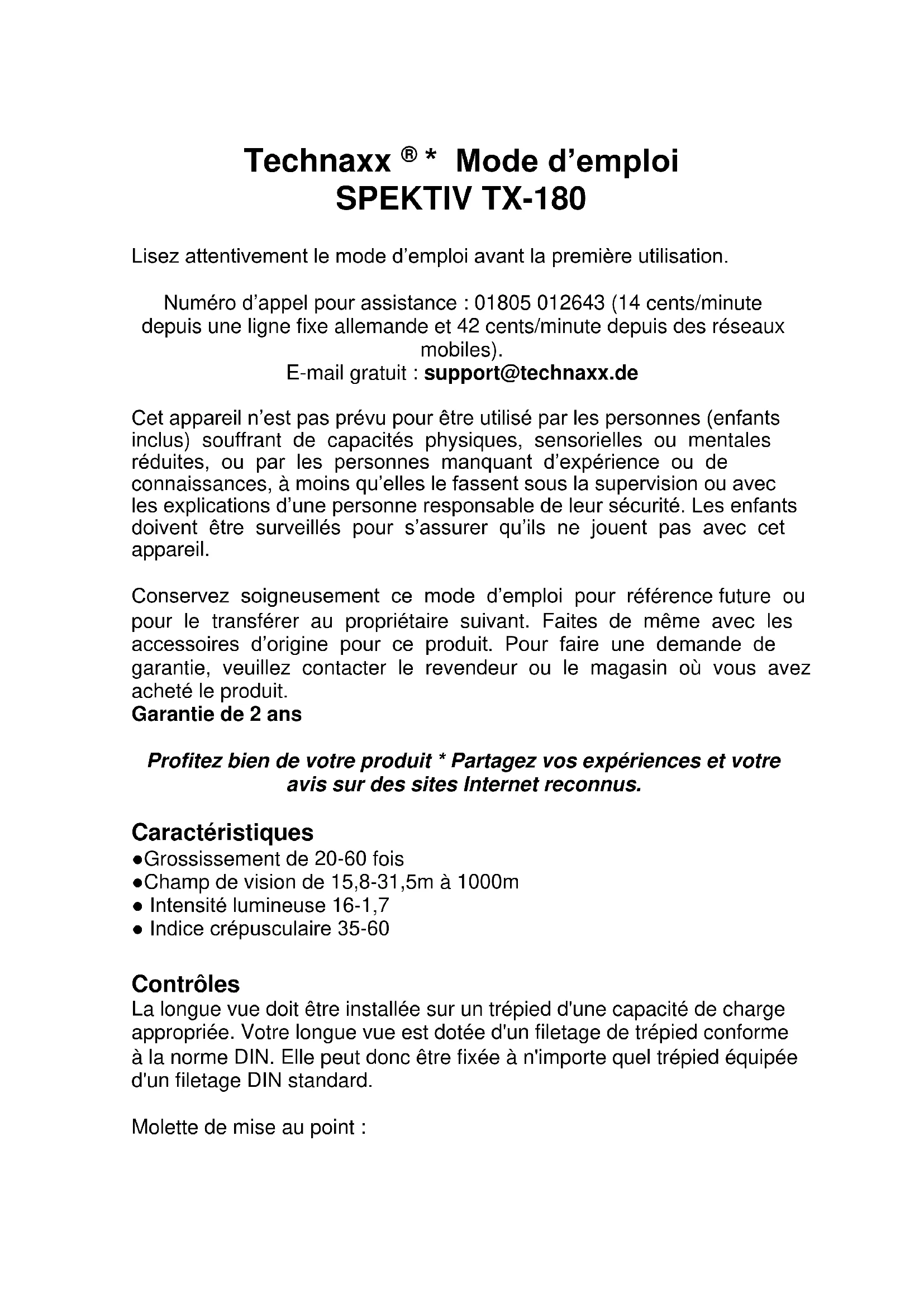 - Mode d’emploi SPEKTIV TX-180 Lisez attentivement le mode d’emploi avant la première utilisation. Numéro d’appel pour assistance : 01805 012643 (14 cents/minute depuis une ligne fixe allemande et 42 cents/minute depuis des réseaux mobiles). E-mail gratuit : support@technaxx.de Cet appareil n’est pas prévu pour être utilisé par les personnes (enfants inclus) souffrant de capacités physiques, sensorielles ou mentales réduites, ou par les personnes manquant d’expérience ou de connaissances, à moins qu’elles le fassent sous la supervision ou avec les explications d’une personne responsable de leur sécurité. Les enfants doivent être surveillés pour s’assurer qu’ils ne jouent pas avec cet appareil. Conservez soigneusement ce mode d’emploi pour référence future ou pour le transférer au propriétaire suivant. Faites de même avec les accessoires d’origine pour ce produit. Pour faire une demande de garantie, veuillez contacter le revendeur ou le magasin où vous avez acheté le produit. Garantie de 2 ans Profitez bien de votre produit * Partagez vos expériences et votre avis sur des sites Internet reconnus. Caractéristiques ●Grossissement de 20-60 fois ●Champ de vision de 15,8-31,5m à 1000m ● Intensité lumineuse 16-1,7 ● Indice crépusculaire 35-60 Contrôles La longue vue doit être installée sur un trépied d'une capacité de charge appropriée. Votre longue vue est dotée d'un filetage de trépied conforme à la norme DIN. Elle peut donc être fixée à n'importe quel trépied équipée d'un filetage DIN standard. Molette de mise au point :Regardez dans l'oculaire (1) et tournez la molette de mise au point (3) dans l'une ou l'autre direction pour effectuer la mise au point sur un objet. Zoom : Tournez le contrôle de zoom (2) pour effectuer un zoom avant ou arrière sur un objet, puis utilisez la molette de mise au point (3) pour affiner. Pare-soleil : Déployez le pare-soleil (9) en cas de fort soleil affectant la visibilité. Placez votre main autour de la bague d'ouverture de la longue vue et poussez simplement le bouclier vers l'extérieur. Observation terrestre Lorsque vous regardez des objets terrestres, votre vue pourrait traverser des vagues de chaleur émises de la surface de la terre. Vous avez peut- être remarqué ces vagues de chaleur en conduisant sur une autoroute pendant l'été. Les vagues de chaleur réduisent la qualité d'image. Si les ondes de chaleur perturbent votre vision, essayez une mise au point à faible puissance pour obtenir une image plus stable et de meilleure qualité. Faites votre observation en début de matinée, avant que la terre n'ait accumulé trop de chaleur. Spécifications Grossissement 20-60 x Objectif Ø 60mm Champ de vision 15,8-31,5m à 1000m Poids/Dimensions 840g / 33x15x7cm