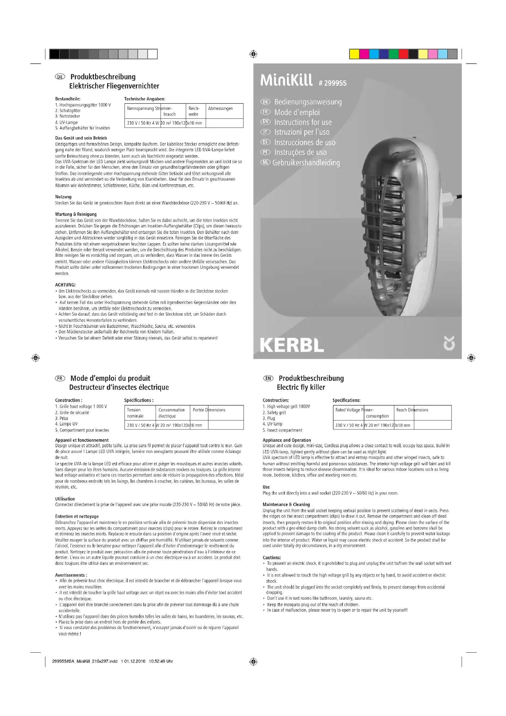 Mode d‘emploi du produit Destructeur d‘insectes électrique Construction :1. Grille haut voltage 1 000 V2. Grille de sécurité3. Prise4. Lampe UV5. Compartiment pour insectesSpécifications : Tension nominaleConsommation électriquePortée Dimensions230 V / 50 Hz 4 W 20 m 190x120x10 mmAppareil et fonctionnementDesign unique et attractif, petite taille. La prise sans fil permet de placer l‘appareil tout contre le mur. Gain de place assuré ! Lampe LED UVA intégrée, lumière non aveuglante pouvant être utilisée comme éclairage de nuit.Le spectre UVA de la lampe LED est ecace pour attirer et piéger les moustiques et autres insectes volants. Sans danger pour les êtres humains. Aucune émission de substances nocives ou toxiques. La grille interne haut voltage anéantira et tuera ces insectes permettant ainsi de réduire la propagation des affections. Idéal pour de nombreux endroits tels les livings, les chambres à coucher, les cuisines, les bureaux, les salles de réunion, etc.Utilisation Connectez directement la prise de l‘appareil avec une prise murale (220-230 V ~ 50/60 Hz) de votre pièce.Entretien et nettoyageDébranchez l‘appareil et maintenez-le en position verticale afin de prévenir toute dispersion des insectes morts. Appuyez sur les arêtes du compartiment pour insectes (clips) pour le retirer. Retirez le compartiment et éliminez les insectes morts. Replacez-le ensuite dans sa position d‘origine après l‘avoir rincé et séché. Veuillez essuyer la surface du produit avec un chiffon pré-humidifié. N‘utilisez jamais de solvants comme l‘alcool, l‘essence ou le benzène pour nettoyer l‘appareil an d‘éviter d‘endommager le revêtement du produit. Nettoyez le produit avec précaution afin de prévenir toute pénétration d‘eau à l‘intérieur de ce dernier. L‘eau ou un autre liquide pourrait conduire à un choc électrique ou à un accident. Le produit doit donc toujours être utilisé dans un environnement sec.Avertissements :• An de prévenir tout choc électrique, il est interdit de brancher et de débrancher l‘appareil lorsque vous avez les mains mouillées• Il est interdit de toucher la grille haut voltage avec un objet ou avec les mains an d‘éviter tout accident ou choc électrique.• L‘appareil doit être branché correctement dans la prise an de prévenir tout dommage dû à une chute accidentelle.• N‘utilisez pas l‘appareil dans des pièces humides telles les salles de bains, les buanderies, les saunas, etc.• Placez la prise dans un endroit hors de portée des enfants.• Si vous constatez des problèmes de fonctionnement, n‘essayez jamais d‘ouvrir ou de réparer l‘appareil vous-même !