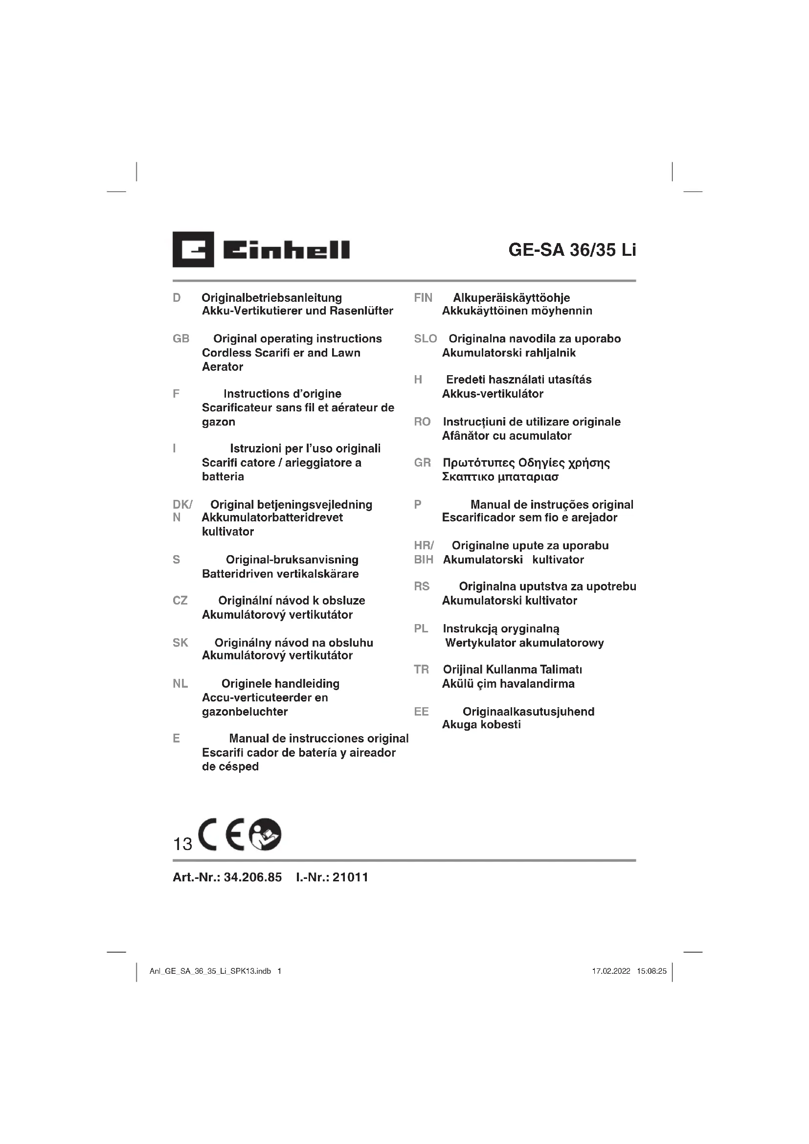 Uniquement pour les pays de l’Union Européenne Ne jetez pas les outils électriques dans les ordures ménagères! Selon la norme européenne 2012/19/CE relative aux appareils électriques et systèmes électroniques usés et selon son application dans le droit national, les outils électriques usés doivent être récoltés à part et apportés à un recyclage respectueux de l’environnement. Possibilité de recyclage en alternative à la demande de renvoi : Le propriétaire de l’appareil électrique est obligé, en guise d’alternative à un envoi en retour, à contribu- er à un recyclage eff ectué dans les règles de l’art en cas de cessation de la propriété. L’ancien appareil peut être remis à un point de collecte dans ce but. Cet organisme devra l’éliminer dans le sens de la Loi sur le cycle des matières et les déchets. Ne sont pas concernés les accessoires et ressources fournies sans composants électroniques. Veuillez noter que lors de la mise au rebut, les accumulateurs et les moyens d’éclairage (par ex. am- poule) sont retirés de l’appareil. Toute réimpression ou autre reproduction de la documentation et des papiers joints aux produits, même sous forme d’extraits, est uniquement permise une fois l’accord explicite de l’Einhell Germany AG obte- nu. Sous réserve de modifi cations techniques Anl_GE_SA_36_35_Li_SPK13.indb 41Anl_GE_SA_36_35_Li_SPK13.indb 41 17.02.2022 15:09:0217.02.2022 15:09:02F
