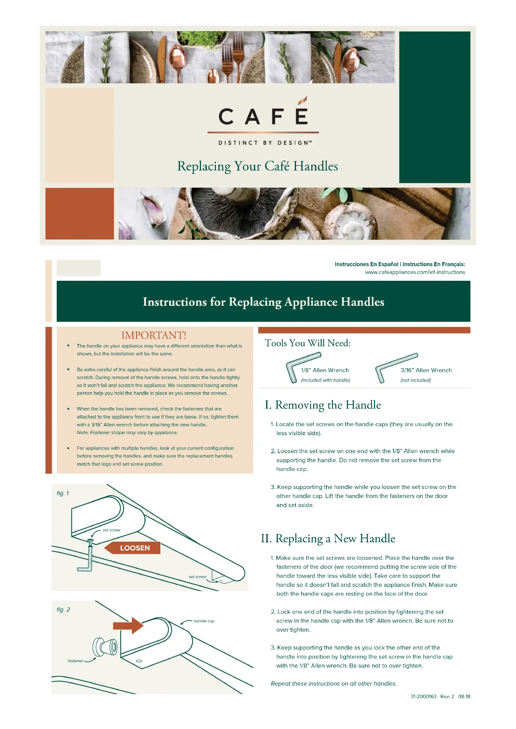 1. Make sure the set screws are loosened. Place the handle over the fasteners of the door (we recommend putting the screw side of the handle toward the less visible side). Take care to support the handle so it doesn’t fall and scratch the appliance finish. Make sure both the handle caps are resting on the face of the door. 2. Lock one end of the handle into position by tightening the set screw in the handle cap with the 1/8” Allen wrench. Be sure not to over tighten. 3. Keep supporting the handle as you lock the other end of the handle into position by tightening the set screw in the handle cap with the 1/8” Allen wrench. Be sure not to over tighten. Repeat these instructions on all other handles. Instructions for Replacing Appliance Handles Instrucciones En Español | Instructions En Français:www.cafeappliances.com/kit-instructions3/16” Allen Wrench(not included)1/8” Allen Wrench(included with handle) Tools You Will Need: LOOSEN fig. 1fig. 2 Replacing Your Café Handles fastener handle cap set screw set screw The handle on your appliance may have a dierent orientation than what is shown, but the installation will be the same. Be extra careful of the appliance finish around the handle area, as it can scratch. During removal of the handle screws, hold onto the handle tightly so it won’t fall and scratch the appliance. We recommend having another person help you hold the handle in place as you remove the screws. When the handle has been removed, check the fasteners that are attached to the appliance front to see if they are loose. If so, tighten them with a 3/16” Allen wrench before attaching the new handle.Note: Fastener shape may vary by appliance. For appliances with multiple handles, look at your current configuration before removing the handles, and make sure the replacement handles match that logo and set screw position. IMPORTANT!31-2000163 Rev. 2 08-18
