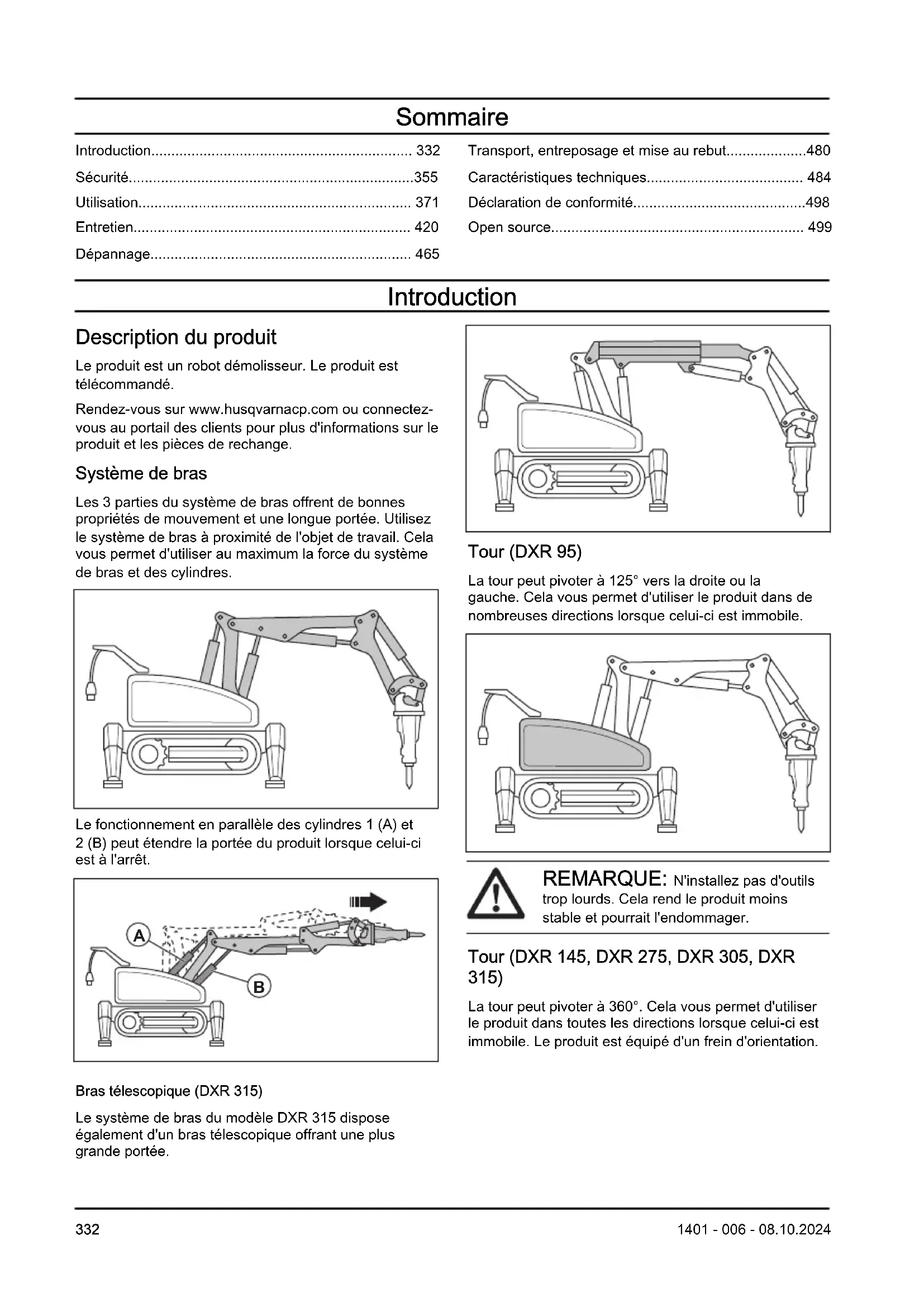 Les outils sont installés sur le porte-outil du système de bras. Utilisez uniquement des outils adaptés à l'opération. Système hydraulique Le circuit hydraulique assure la pression et le débit hydrauliques dans le produit. Le circuit hydraulique comporte un réservoir d'huile hydraulique pourvu de filtres, d'une pompe hydraulique, d'un refroidisseur d'huile hydraulique, de moteurs hydrauliques, de cylindres hydrauliques et de différents types de vannes. Les composants sont raccordés entre eux au moyen de flexibles ou de tuyaux. Des vannes de régulation de pression sont chargées de limiter ou de réduire la pression au niveau des vannes. Des vannes de régulation de débit contrôlent le débit d'huile hydraulique et la vitesse de fonctionnement du produit. Des vannes de commande directionnelles garantissent que l'huile hydraulique est acheminée vers les différentes fonctions du produit. Le système hydraulique présente différents niveaux de pression. Reportez-vous à la section Caractéristiques techniques à la page 484 . Si plusieurs fonctions sont utilisées simultanément, la pression est réglée sur la valeur la plus faible. Si la température de l'huile est supérieure à 80°C (176°F), la pression du marteau diminue automatiquement. Cela prolonge la durée de fonctionnement avant la surchauffe du produit. Utilisation prévue Le produit est utilisé pour la démolition dans de nombreux environnements différents et pour différents types de constructions. Le produit peut être utilisé dans des zones à risque, par exemple lorsqu'il existe un risque de chute d'objets. La télécommande permet à l'opérateur de contrôler le produit à distance de la zone à risque, en toute sécurité. Le produit peut être utilisé à l'intérieur comme à l'extérieur. N'utilisez pas ce produit pour d'autres travaux. Le produit doit être utilisé uniquement par des opérateurs professionnels ayant de l'expérience. Nous travaillons en permanence à l'amélioration de votre sécurité et de votre efficacité pendant l'utilisation. Pour davantage d'informations, contactez votre atelier d'entretien. Les modèles DXR 145, DXR 275, DXR 305 et DXR 315 peuvent être équipés pour des températures très élevées et peuvent également être utilisés dans des environnements contenant des substances dangereuses et des produits chimiques. Remarque: Les législations nationales ou locales peuvent limiter l'utilisation de ce produit. 334 1401 - 006 - 08.10.2024Présentation du produit (DXR 95)
