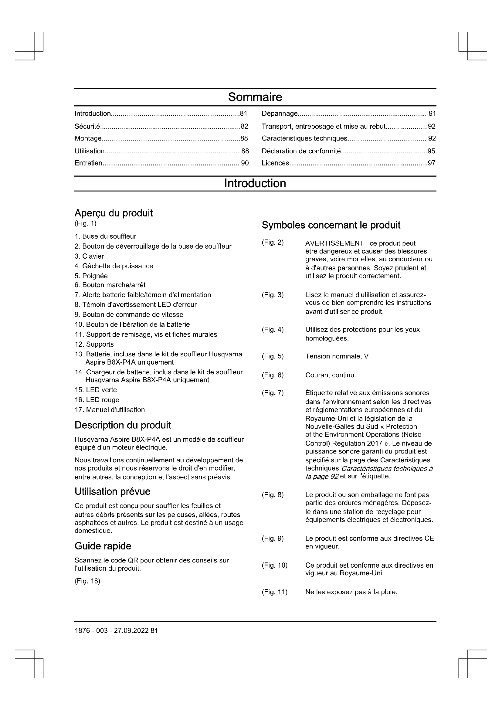 être dangereux et causer des blessures graves, voire mortelles, au conducteur ou à d'autres personnes. Soyez prudent et utilisez le produit correctement. (Fig. 3) Lisez le manuel d'utilisation et assurez- vous de bien comprendre les instructions avant d'utiliser ce produit. (Fig. 4) Utilisez des protections pour les yeux homologuées. (Fig. 5) Tension nominale, V (Fig. 6) Courant continu. (Fig. 7) Étiquette relative aux émissions sonores dans l'environnement selon les directives et réglementations européennes et du Royaume-Uni et la législation de la Nouvelle-Galles du Sud «Protection of the Environment Operations (Noise Control) Regulation 2017». Le niveau de puissance sonore garanti du produit est spécifié sur la page des Caractéristiques techniques Caractéristiques techniques à la page 92 et sur l'étiquette. (Fig. 8) Le produit ou son emballage ne font pas partie des ordures ménagères. Déposez- le dans une station de recyclage pour équipements électriques et électroniques. (Fig. 9) Le produit est conforme aux directives CE en vigueur. (Fig. 10) Ce produit est conforme aux directives en vigueur au Royaume-Uni. (Fig. 11) Ne les exposez pas à la pluie. 1876 - 003 - 27.09.2022 81(Fig. 15) L'opérateur du souffleur doit veiller à ce qu'aucune personne ou aucun ani- mal ne se trouve à moins de 15mè- tres. Lorsque plusieurs opérateurs par- tagent le même lieu de travail, la dis- tance de sécurité doit être de 15mè- tres au minimum. Le souffleur peut projeter violemment des objets pou- vant ricocher. Ceci peut provoquer de graves blessures aux yeux si l'équipe- ment de protection personnelle recom- mandé n'est pas utilisé. yyyy wwxxxxx La plaque signalétique indique le nu- méro de série. yyyy désigne l'année de production et ww désigne la semai- ne de production. Remarque: Les autres symboles/autocollants présents sur le produit concernent des exigences de certification spécifiques à certains marchés. Symboles sur la batterie et/ou son chargeur (Fig. 16) Déposez ce produit dans une station de recyclage pour équipements électri- ques et électroni- ques. (Concerne seu- lement l'Europe) (Fig. 17) Utilisez la batterie uniquement dans les produits des partenai- res du système PO- WER FOR ALL. (Fig. 12) Transformateur à sécurité intégrée. (Fig. 13) Utilisez et stockez le chargeur de batterie en intérieur uniquement. (Fig. 14) Double isolation. Responsabilité Conformément à la loi sur la responsabilité du fait des produits, nous déclinons toute responsabilité pour tout dommage causé par notre produit si: