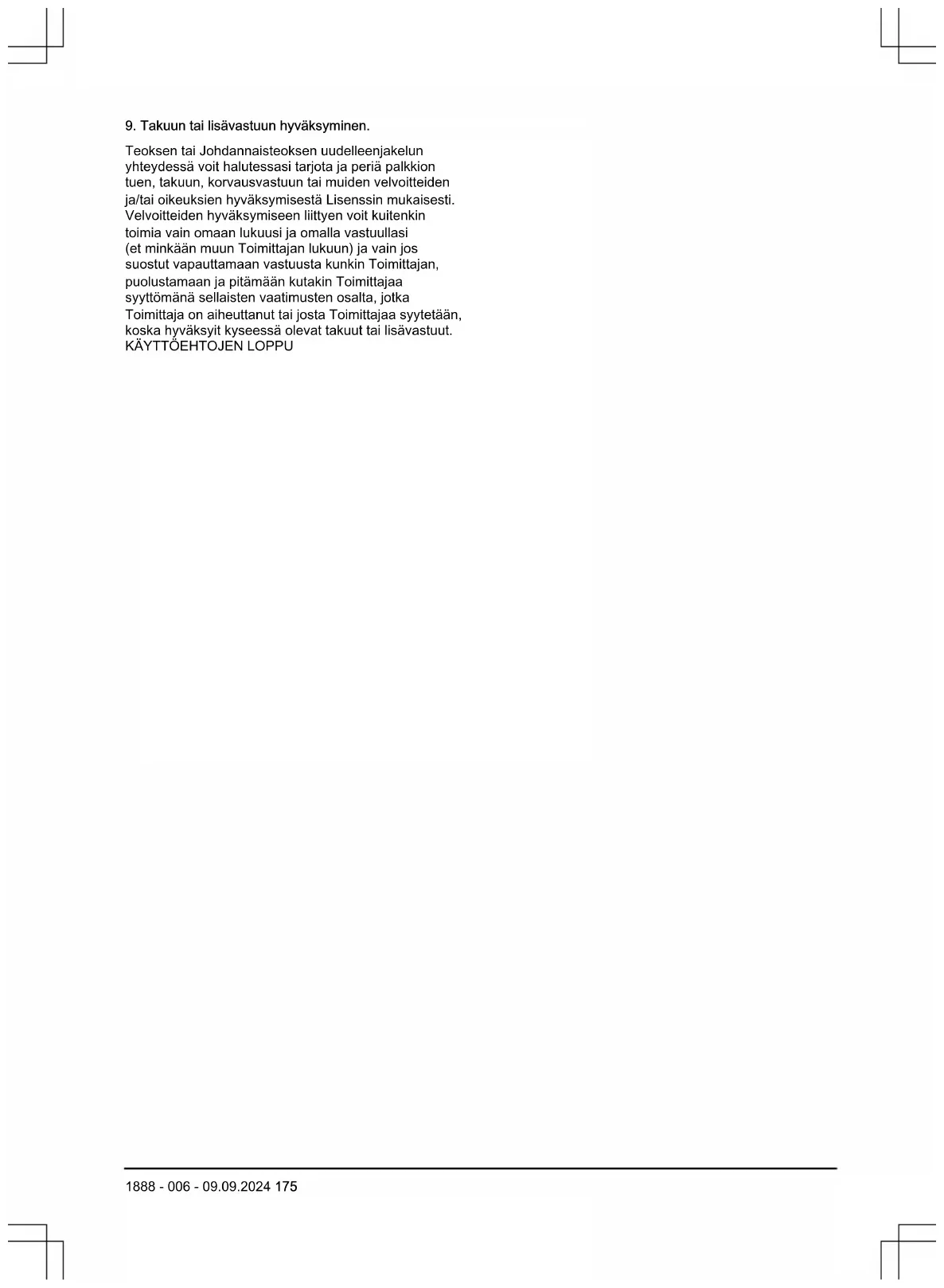 1888 - 006 - 09.09.2024en vertu de la présente Licence. 8. Limitation de responsabilité. En aucun cas et sous aucune théorie de droit, que ce soit de manière délictuelle (y compris par négligence), contractuelle ou autre, sauf si requis par la loi en vigueur (par exemple pour des actes délibérés et grossièrement négligents) ou convenu par écrit, un Contributeur ne sera tenu responsable envers vous de dommages, y compris tout dommage direct, indirect, spécial, accidentel, ou consécutif de quelque nature que ce soit résultant de la présente Licence ou de l'utilisation ou de l'incapacité à utiliser l'Œuvre (y compris, mais sans s'y limiter, les dommages pour perte de clientèle, arrêt de travail, défaillance ou dysfonctionnement de l'ordinateur, ou tout autre dommage ou perte commercial), même si le Contributeur a été informé de la possibilité de tels dommages.