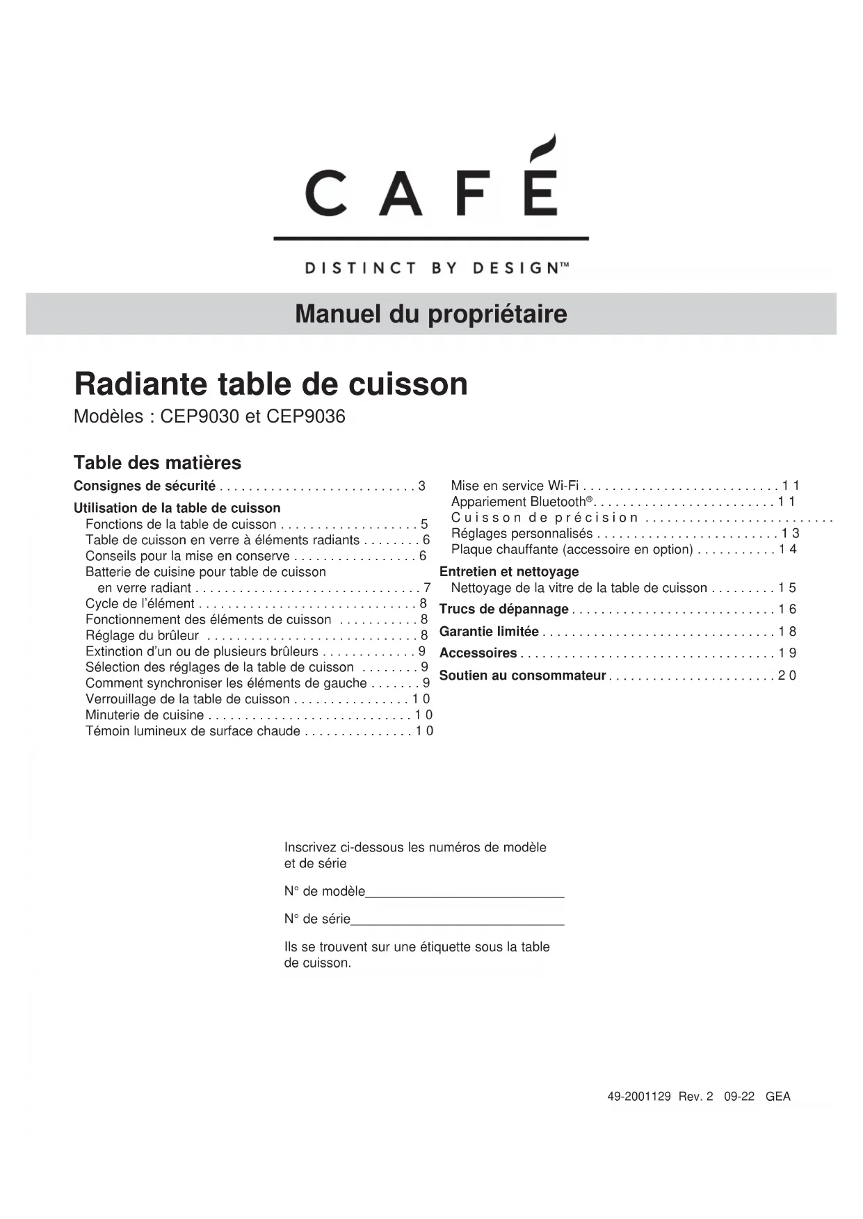 - Soutien au consommateur Manuel du propriétaire2 49-2001129 Rev. 2 NOUS VOUS REMERCIONS D’ACCUEILLIR CAFÉ CHEZ VOUS Nous sommes fiers du savoir-faire, de l’innovation et de l’esthétique qui composent chaque appareil CAFÉ, et nous pensons que vous le serez aussi. Dans cette optique, nous vous rappelons que l’enregistrement de votre électroménager vous assure la communication de renseignements importants sur le produit et la garantie lorsque vous en avez besoin. Enregistrez votre électroménager CAFÉ en ligne dès maintenant. Des sites web et des numéros de téléphone utiles figurent dans la section Soutien au consommateur de ce manuel d’utilisation. Vous pouvez aussi poster la fiche de garantie pré-imprimée incluse dans l’emballage.49-2001129 Rev. 2 3 p. 20