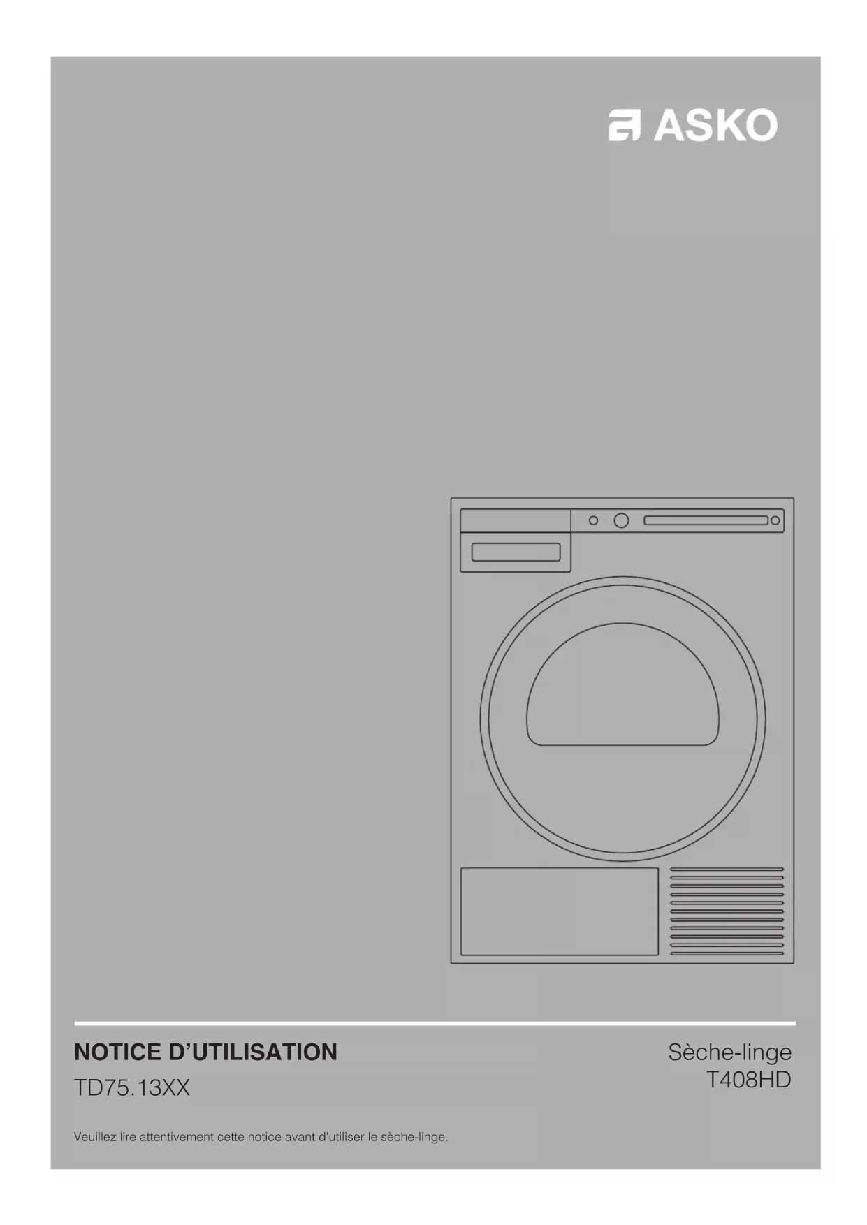 TD75.13XX Veuillez lire attentivement cette notice avant d'utiliser le sèche-linge. Sèche-linge T408HD2 Les pictogrammes figurant dans cette notice ont les significations suivantes: Informations, conseils, astuces, ou recommandations Attention – risque de brûlure Attention – danger Attention – risque d'incendie Attention – risque de choc électrique Voir Guide de mise en service rapide sur la dernière page. Chère Cliente, Cher Client, Nous vous remercions d'avoir choisi ce produit de qualité ASKO. Nous espérons qu'il répondra à vos attentes. Le design scandinave associe des lignes pures, des fonctionnalités adaptées au quotidien et une excellente qualité. Tous nos produits bénéfi cient de ces caractéristiques essentielles qui justifi ent leur succès dans le monde entier. Nous vous recommandons de lire d'abord cette notice avant d'utiliser votre appareil pour la première fois. Ce manuel vous indique aussi comment vous pouvez contribuer à la protection de l'environnement. SOMMAIRE Notice originale Consignes de sécurité 3 Description du sèche-linge 7 Avant d'utiliser l'appareil pour la première fois 8 Installation et raccordement 9 Conseils préliminaires au séchage 21 Les étapes du séchage (1 à 7) 23 Réglages système 31 Nettoyage et entretien 35 Que faire en cas de problèmes ? 41 Service après-vente 45 Informations techniques 46 Tableau des consommations 48 Mise au rebut 50 Guide d'utilisation rapide 513