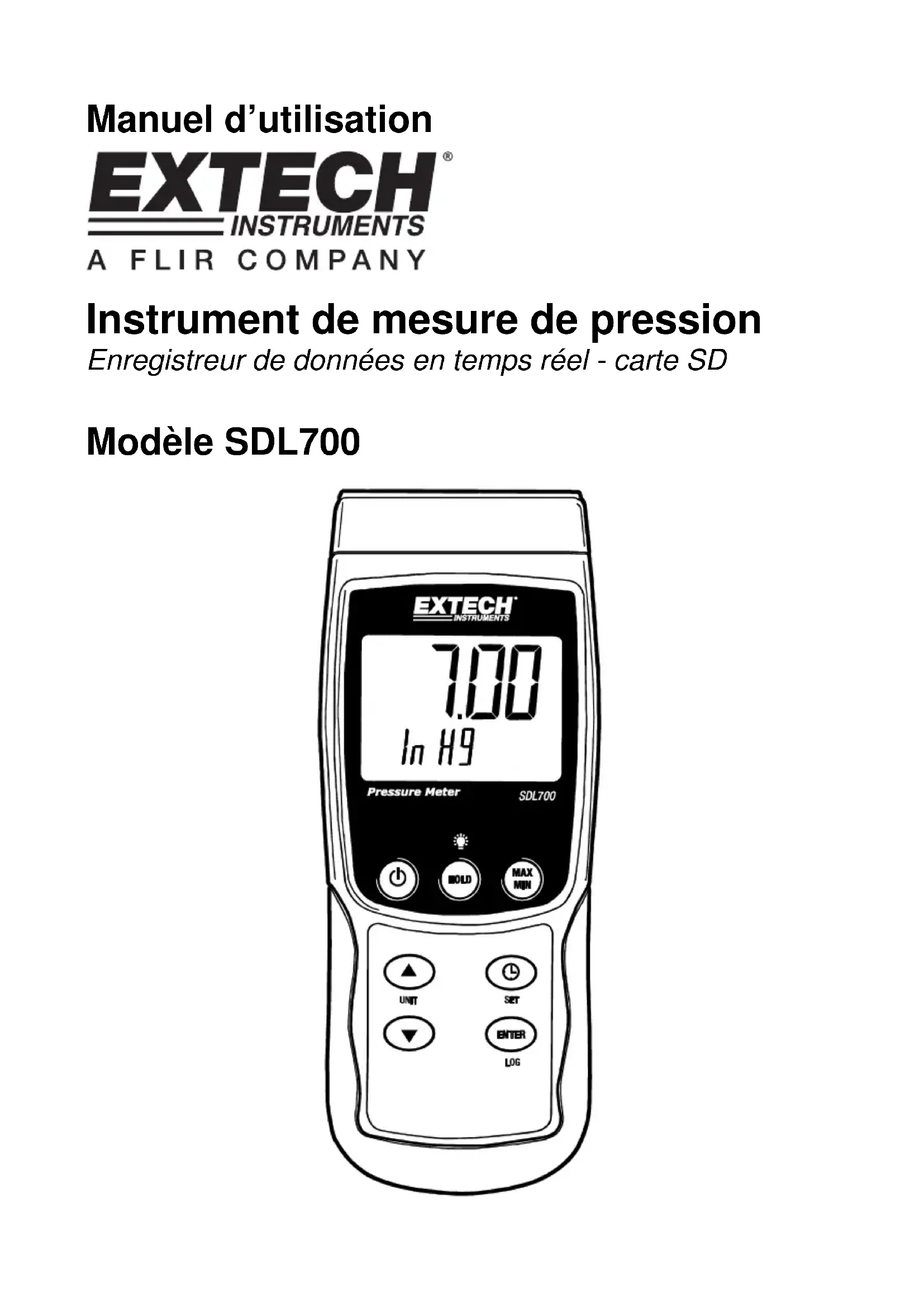 Introduction Félicitations pour votre achat de l’instrument de mesure pour pression Extech SDL700, un métreur de série Logger SD. Cet instrument de mesure affiche et enregistre des lectures de pression à partir de sondes de pression en option sur une plage de 30, 150, 300 psi. Les unités de relevés de mesure compatibles sont en barres, psi, kg/cm