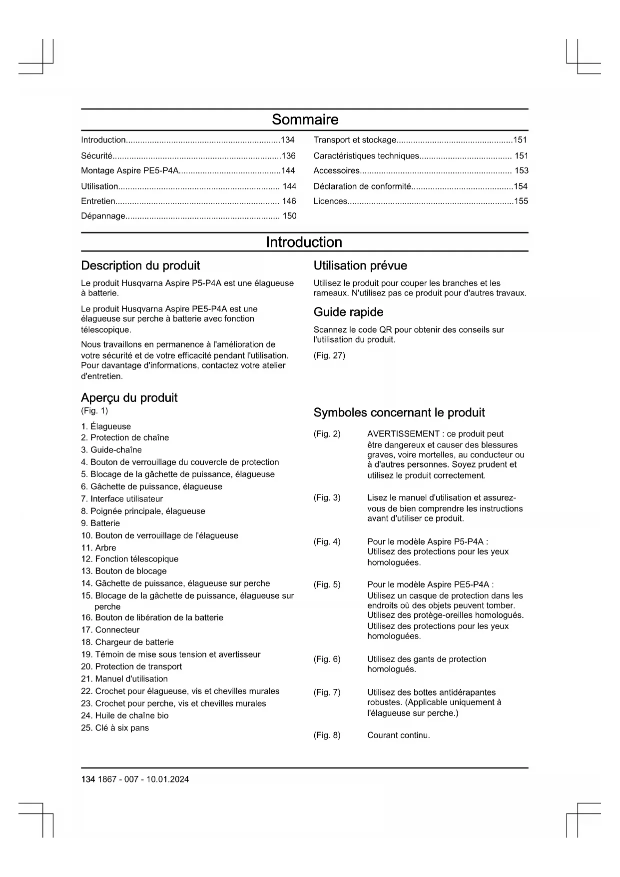 être dangereux et causer des blessures graves, voire mortelles, au conducteur ou à d'autres personnes. Soyez prudent et utilisez le produit correctement. (Fig. 3) Lisez le manuel d'utilisation et assurez- vous de bien comprendre les instructions avant d'utiliser ce produit. (Fig. 4) Pour le modèle Aspire P5-P4A: Utilisez des protections pour les yeux homologuées. (Fig. 5) Pour le modèle Aspire PE5-P4A: Utilisez un casque de protection dans les endroits où des objets peuvent tomber. Utilisez des protège-oreilles homologués. Utilisez des protections pour les yeux homologuées. (Fig. 6) Utilisez des gants de protection homologués. (Fig. 7) Utilisez des bottes antidérapantes robustes. (Applicable uniquement à l'élagueuse sur perche.) (Fig. 8) Courant continu. 134 1867 - 007 - 10.01.2024(Fig. 9) Tension nominale, V (Fig. 10) Ne les exposez pas à la pluie. (Fig. 11) Remplissage d'huile de chaîne. (Fig. 12) Sens de rotation de la chaîne. (Fig. 13) Risque de blessure. Gardez les mains à distance de la chaîne. (Fig. 14) Tournez vers la gauche pour desserrer le bouton, tournez vers la droite pour serrer le bouton. (Fig. 15) Le produit est conforme aux directives de l'UE en vigueur. (Fig. 16) Ce produit est conforme aux directives en vigueur au Royaume-Uni. (Fig. 17) Étiquette relative aux émissions sonores dans l'environnement selon les directives et réglementations européennes et du Royaume-Uni et la législation de la Nouvelle-Galles du Sud «Protection of the Environment Operations (Noise Control) Regulation 2017». Le niveau de puissance sonore garanti du produit est spécifié dans les caractéristiques techniques à la page Caractéristiques techniques à la page 151 et sur l'étiquette. (Fig. 18) Le produit ou son emballage ne font pas partie des ordures ménagères. Déposez- le dans une station de recyclage pour équipements électriques et électroniques. (Fig. 21) Ce produit ne comporte pas d'isolation électrique. Si le produit entre en contact avec ou est utilisé à proximité de lignes conductrices de tension, ceci peut entraî- ner des blessures graves, voire mortelles. L’électricité peut être transmise d’un point à un autre par un arc de tension. Plus la tension est élevée et plus la longueur de transmission de la tension est élevée. L’électricité peut également être transmise par des branches et d’autres objets, particulièrement s’ils sont mouillés. Toujours conserver une distance d'au moins 10m entre le produit et la ligne conductrice d'électricité et/ou les objets en contact avec cette ligne. Si vous ne pouvez pas respecter cette distance de sécurité, contactez toujours la compagnie électrique afin de s'assurer que la tension a été coupée avant de commencer les travaux. L'opérateur du produit doit s'assurer qu'aucune personne ou aucun animal ne s'approche à moins de 15mètres pendant le travail. (Applicable uniquement à l'élagueuse sur perche.) (Fig. 22) La plaque signalétique ou l'impression au laser indiquent le numéro de série. yyyy désigne l'année de production et ww désigne la semaine de production. Remarque: Les autres symboles/autocollants présents sur le produit concernent des exigences de certification spécifiques à certains marchés. Symboles sur la batterie et/ou son chargeur (Fig. 23) Déposez ce produit dans une station de recyclage pour équipements électri- ques et électroni- ques. (Concerne seu- lement l'Europe) (Fig. 24) Utilisez la batterie uniquement dans les produits des partenai- res du système PO- WER FOR ALL. (Fig. 25) Protégez la batterie de la chaleur, par exemple contre la lumière intense du soleil, le feu, la saleté, l'eau et l'humi- dité. Il existe un risque d'explosion et de court-circuit. (Fig. 26) (Fig. 19) Utilisez et stockez le chargeur de batterie en intérieur uniquement. (Fig. 20) Double isolation. 1867 - 007 - 10.01.2024 135Endommagement du produit Nous ne sommes pas responsables des dommages subis par le produit si: