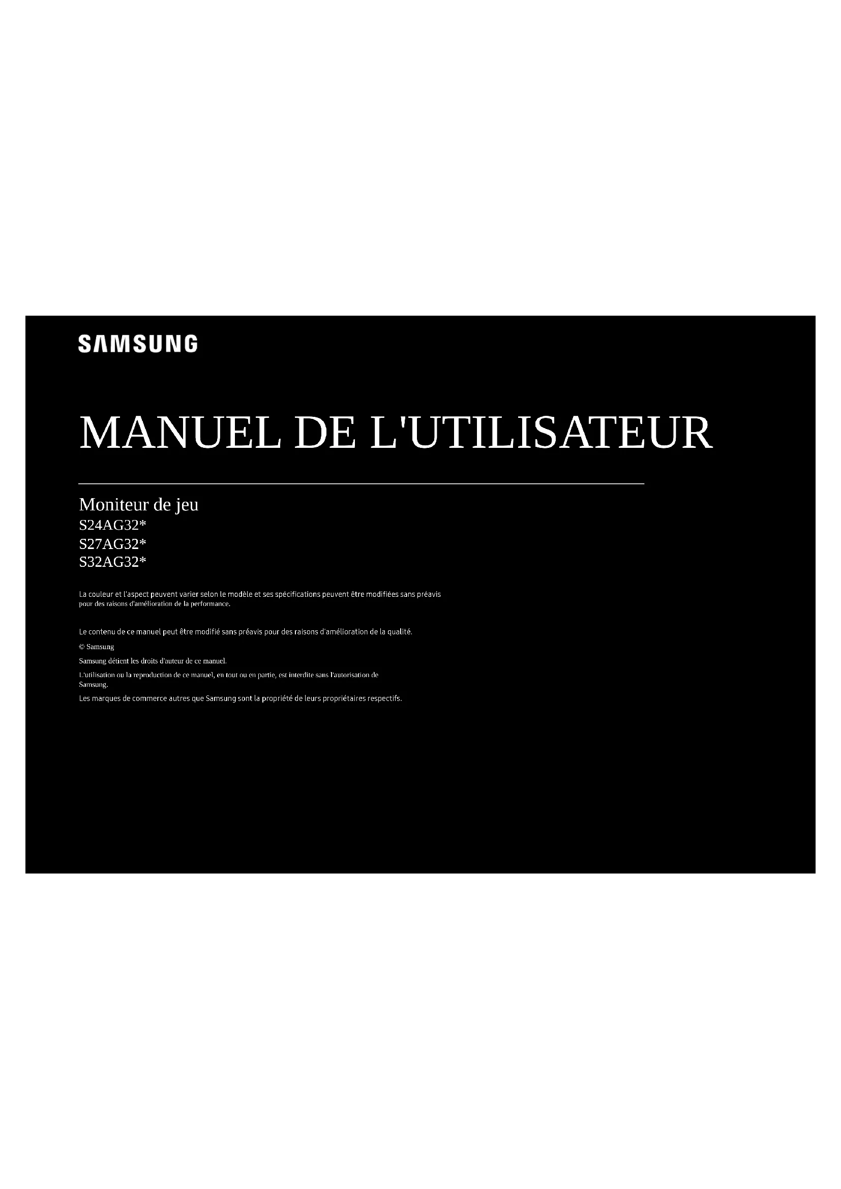 Moniteur de jeu S24AG32* S27AG32* S32AG32* La couleur et l'aspect peuvent varier selon le modèle et ses spécications peuvent être modiées sans préavis pour des raisons d'amélioration de la performance. Le contenu de ce manuel peut être modié sans préavis pour des raisons d'amélioration de la qualité. © Samsung Samsung détient les droits d'auteur de ce manuel. L'utilisation ou la reproduction de ce manuel, en tout ou en partie, est interdite sans l'autorisation de Samsung. Les marques de commerce autres que Samsung sont la propriété de leurs propriétaires respectifs.2 Table des matières Avant l'utilisation Consignes de sécurité 4 Électricité et sécurité 4 Installation de l'appareil 5 Fonctionnement 6 Nettoyage 8 Position correcte pour utiliser l'appareil 8 Préparation Installation de l'appareil 9 Fixation au support 9 Précautions lors du déplacement du produit 10 Vérication de l'espace autour du produit 11 Réglage de l'inclinaison et de la hauteur 11 Rotation du produit 12 Dispositif antivol 13 Fiche technique du support mural (VESA) 13 Panneau de conguration 14 Connexion et utilisation d’un périphérique source Lisez les informations ci-dessous avant de connecter le produit. 15 Connecteurs 15 Connexion et utilisation d'un PC 16 Connexion à l'aide d'un câble HDMI 16 Connexion à l'aide d'un câble HDMI-DVI 16 Connexion à l'aide d'un câble DP 16 Branchement sur un casque audio ou à des écouteurs 16 Branchement du cordon d’alimentation 17 Rangement des câbles connectés 17 Réglage de la résolution optimale 18 Menu Jeu 19 Image 21 Afch. à l'écran 23 Système 23 Informations 25 Installation du logiciel Easy Setting Box 26 Restrictions et problèmes liés à l'installation 26 Conguration système requise 26 Installation du pilote 263 Guide de dépannage Prérequis avant de contacter le Centre de service à la clientèle Samsung 27 Diagnostic du produit (problème d’écran) 27 Vérication de la résolution et de la fréquence 27 Vériez les éléments suivants. 27 Questions & réponses 30 Spécications Général 31 Tableau des modes de signal standard 33 Annexe Service payant (frais facturés aux clients) 35 L'appareil ne présente pas de défaut 35 Dommage causé au produit par la faute du client 35 Autres raisons 35 FreeSync (pour carte graphique AMD) 36 Table des matières4