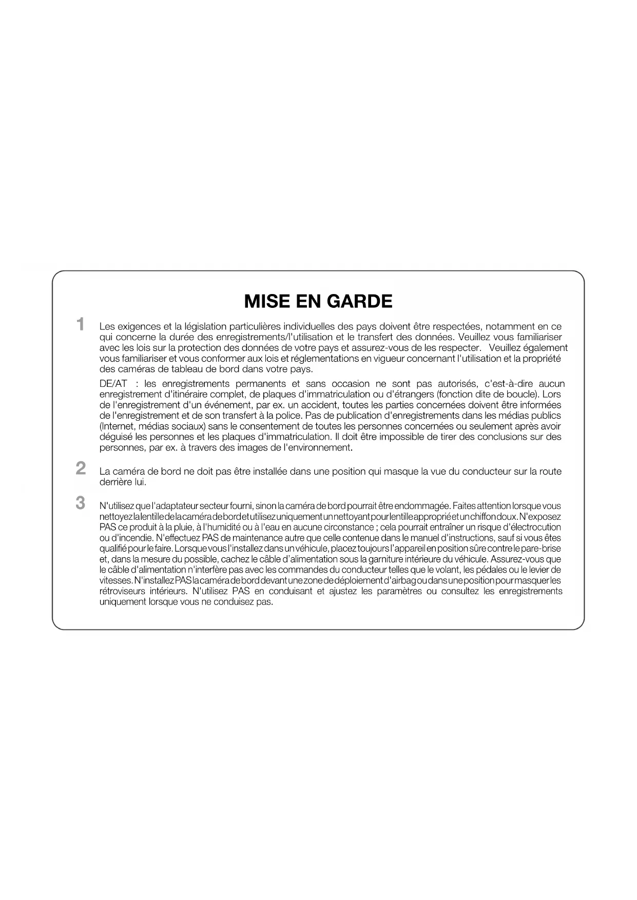Les exigences et la législation particulières individuelles des pays doivent être respectées, notamment en ce qui concerne la durée des enregistrements/l'utilisation et le transfert des données. Veuillez vous familiariser avec les lois sur la protection des données de votre pays et assurez-vous de les respecter. Veuillez également vous familiariser et vous conformer aux lois et réglementations en vigueur concernant l'utilisation et la propriété des caméras de tableau de bord dans votre pays.
