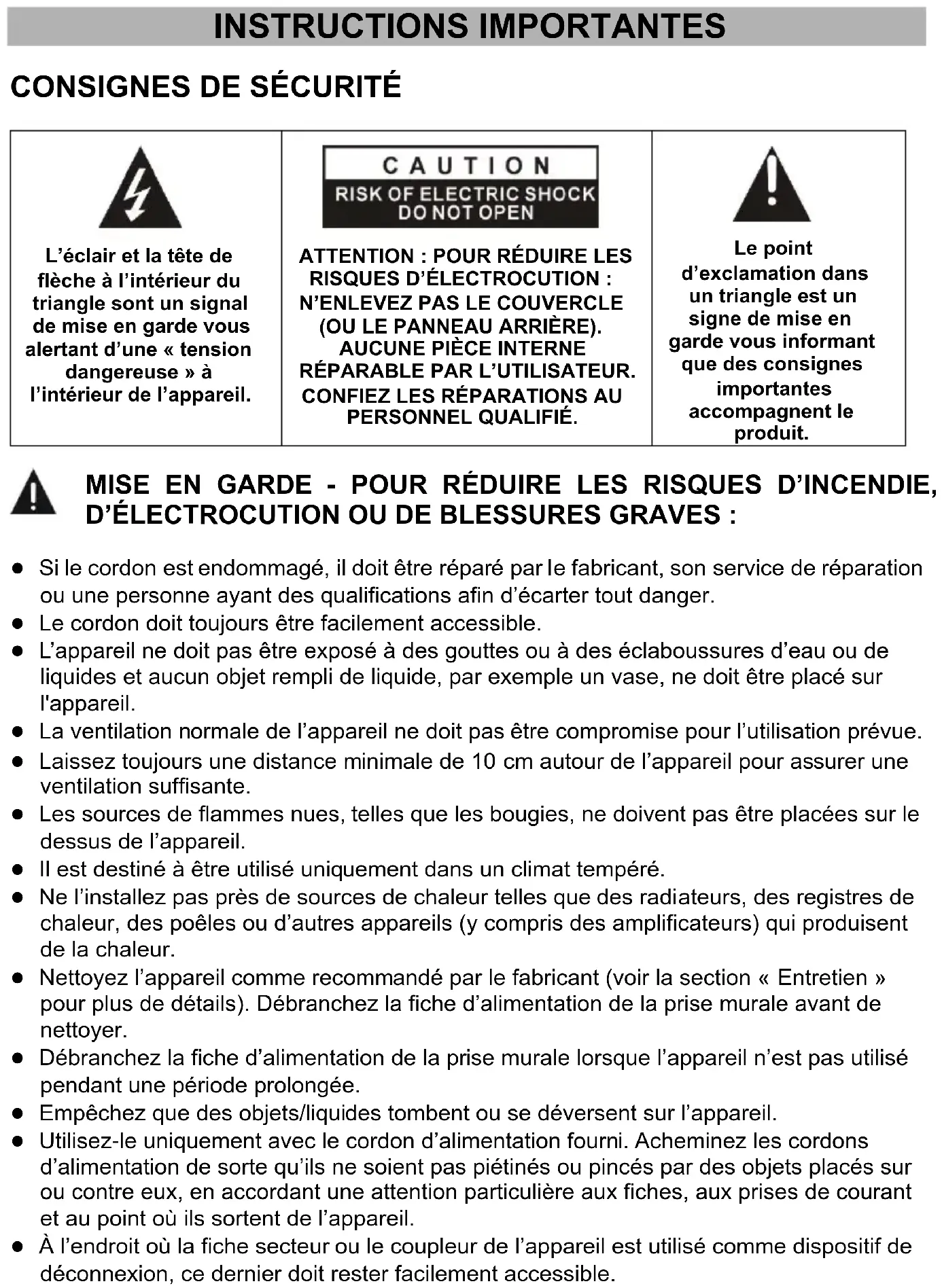 ATTENTION : POUR RÉDUIRE LES RISQUES D’ÉLECTROCUTION : N’ENLEVEZ PAS LE COUVERCLE (OU LE PANNEAU ARRIÈRE). AUCUNE PIÈCE INTERNE RÉPARABLE PAR L’UTILISATEUR. CONFIEZ LES RÉPARATIONS AU PERSONNEL QUALIFIÉ.