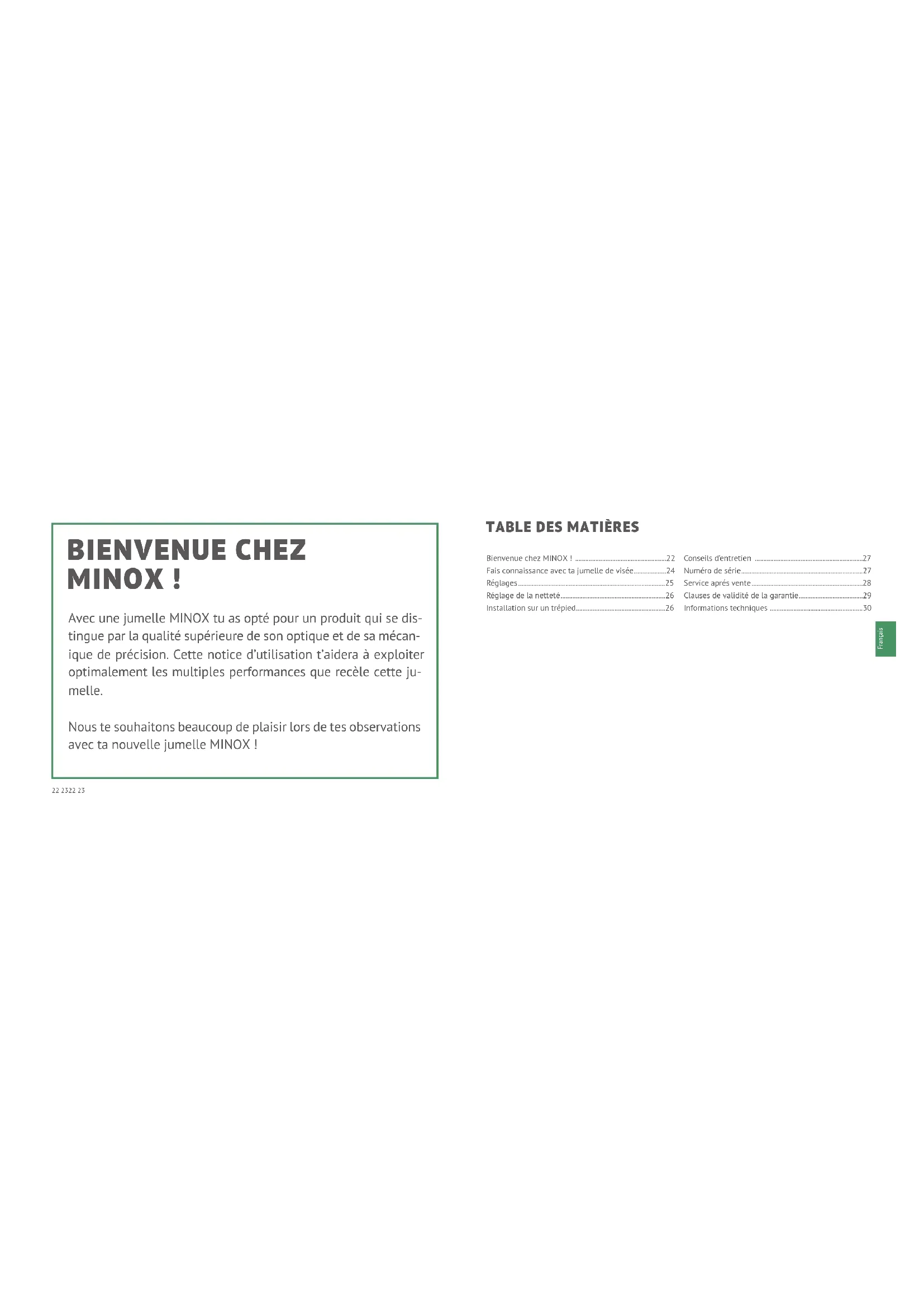 - Informations techniques BIENVENUE CHEZ MINOX ! Avec une jumelle MINOX tu as opté pour un produit qui se dis- tingue par la qualité supérieure de son optique et de sa mécan- ique de précision. Cette notice d’utilisation t’aidera à exploiter optimalement les multiples performances que recèle cette ju- melle. Nous te souhaitons beaucoup de plaisir lors de tes observations avec ta nouvelle jumelle MINOX !24 2524 25 Français p. 30