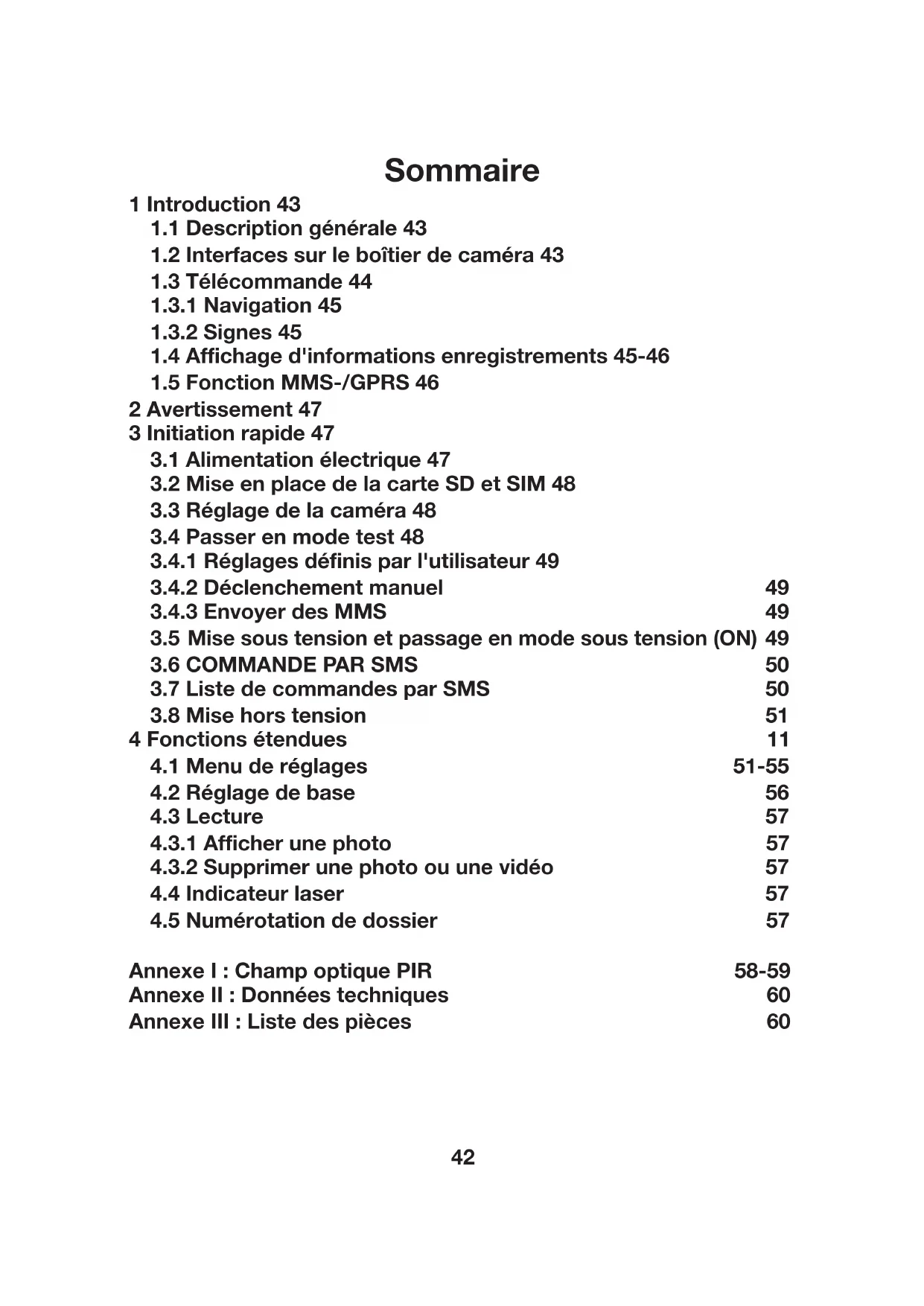 Ce mode peut être activé uniquement avec la caméra allumée (ON). La caméra envoie un MMS chaque fois qu'elle prend une photo. Vous pouvez choisir le nombre d'image à envoyer quotidienne- ment. Si la caméra est en mode photo, que vous sélecti- onnez le mode MMS "Immédiat" et que vous réglez le nombre MAX à 10, la caméra envoie 10 MMS en 24 heures. Elle continue ensuite à prendre des photos et les sauvegarde sur la carte SD. Après 24 heures, la caméra renvoie un MMS lorsque des photos sont prises. En mode vidéo, la caméra envoie un SMS au lieu d'un MMS. Envoyer à Choisissez si vous voulez envoyer l'image sur votre téléphone ou à votre adresse email. 1> Téléphone(MMS) : L'image est envoyé sur le téléphone mobile via WAP. 2> Email(MMS) : L'image est envoyée à l'adresse email via WAP. 3> Email(GPRS) : L'image est envoyée à l'adresse email via SMTP. Cette méthode permet de réduire notablement les coûts de connexion dans de nombreux pays. Commande par La commande SMS permet d'activer une fonction de communication à double sens. Lorsque vous mettez en route la commande SMS, la caméra peut recevoir vos ordres SMS et y réagir. Vous pouvez en outre afficher des images en temps réel à tout moment. Toutefois, la consommation d'électricité est un peu plus élevée qu'en mode de chasse normal. Version Ce paramètre affiche des informations sur le micrologiciel et l'IMEI de cette caméra. Formater la carte Toutes les images et toutes les vidéos sont supprimées de la carte SD. Pour cette raison, assurez-vous d'avoir mis en lieu sûr les données. Réglage de base Faire revenir tous les réglages définis par l'utilisateur SD aux réglages de base.56