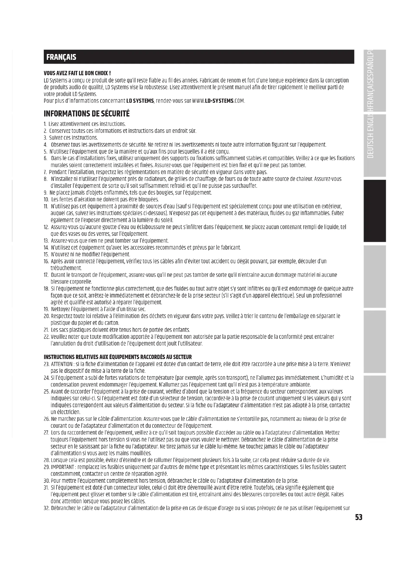 Nosconditionsactuellesdegarantieetdelimitationderesponsabilitésontdisponiblesàl‘adressesuivante:https://cdn-shop.adamhall.com/ media/pdf/MANUFACTURERS-DECLARATIONS_LD_SYSTEMS.pdf.Pourlesréparations,veuillezcontacterAdamHallGmbH,Adam-Hall-Str.1,61267Neu Anspach / E-Mail Info@adamhall.com / +49 (0)6081 / 9419-0. TRI ET MISE AUX DÉCHETS CORRECTE DE CE PRODUIT (Valid in the European Union and other European countries with waste separation) (Applicabledansl‘UnionEuropéenneetlesautrespayseuropéenspratiquantletridesdéchets)Laprésencedecesymbolesurleproduit ousurladocumentationcorrespondanteindiquequ‘enfindevie,leproduitnedoitpasêtrejetéaveclesdéchetsnormaux,afind‘évitertout dommageàl‘environnementouauxpersonnesconsécutiveàuneéliminationnoncontrôléedesdéchets.Séparez-ledesautrestypesdedéchetset recyclez-le,afindepromouvoirlaréutilisationdurabledesressourcesnaturelles.Nousconseillonsauxutilisateursnonprofessionnelsdecontacter lerevendeurchezquiilsontachetéleproduit,ouunreprésentantgouvernementallocal,pourplusdedétailssurlelieudecollecteetlafaçonde recycler cet appareil dans le meilleur respect de l‘environnement possible.. Nous invitons les utilisateurs professionnels à contacter leur fournisseur etàvérifierlestermesetconditionsdeleurcontratd‘achat.Ceproduitnedoitpasêtremélangéàd‘autresdéchetscommerciauxlorsdelacollecte. CONFORMITÉ CE LasociétéAdamHallGmbHdéclareparlaprésentequeceproduitestcompatibleaveclesrégulationssuivantes(lecaséchéant): R&TTE (1999/5/EG) et RED (2014/53/EU) à partir de juin 2017 Directive basse tension (2014/35/EU) Directive CEM (2014/30/EU) RoHS (2011/65/EU) LaDéclarationdeConformitécomplèteestdisponiblesurlesiteWebwww.adamhall.com. Pourtouteinformationcomplémentaire,contactez-nous:info@adamhall.com.