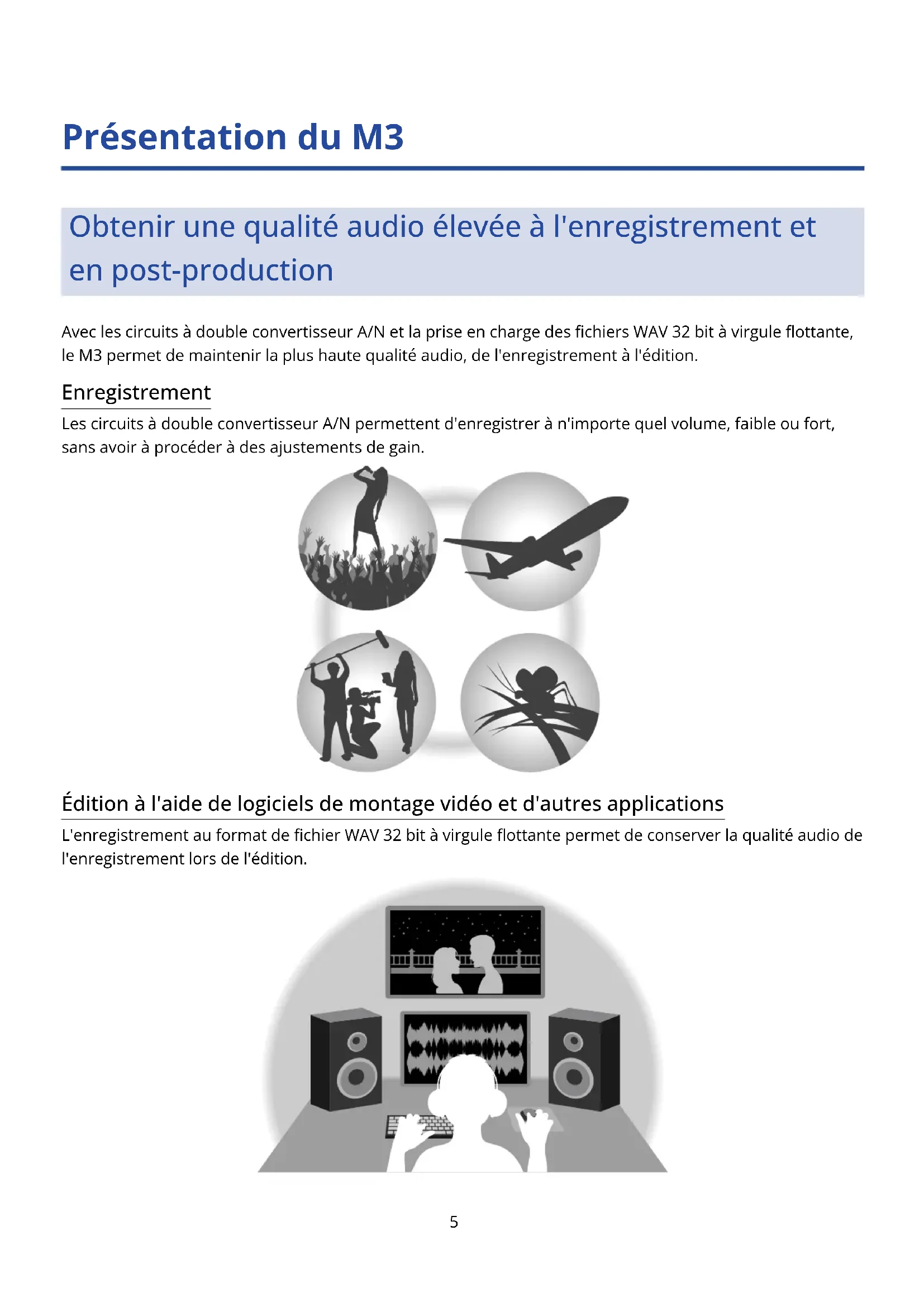 - L'enregistrement de sources soumises à droits d'auteur dont des CD, disques, bandes, prestations live, œuvres vidéo et émissions sans la permission du détenteur des droits dans tout autre but qu'un usage personnel est interdit par la loi. ZOOM CORPORATION n'assumera aucune responsabilité quant aux infractions à la loi sur les droits d'auteur. 2Table des matières Remarques concernant ce mode d'emploi............................................................................................................. 2 Présentation du M3.................................................................................................................................................... 5 Obtenir une qualité audio élevée à l'enregistrement et en post-production....................................................5 Obtention d'une super directivité.......................................................................................................................... 10 Système de prise de son au format Mid-Side......................................................................................................10 Fonctions des parties................................................................................................................................................11 Processus d'enregistrement.................................................................................................................................... 15 Préparations...............................................................................................................................................................16 Fourniture de l'alimentation....................................................................................................................................16 Insertion de cartes microSD....................................................................................................................................18 Formatage de la carte microSD au démarrage....................................................................................................19 Démarrage sans formatage de la carte microSD.................................................................................................21 Mise hors tension......................................................................................................................................................21 Montage sur un appareil photo..............................................................................................................................22 Réglages du matériel................................................................................................................................................ 23 Réglages d'entrée......................................................................................................................................................24 Réglage de la largeur stéréo................................................................................................................................... 24 Réduction du bruit (coupure des basses fréquences)........................................................................................ 25 Enregistrement.......................................................................................................................................................... 26 Écoute de contrôle des sons entrants...................................................................................................................26 Enregistrement...........................................................................................................................................................27 Lecture des enregistrements.................................................................................................................................. 28 Gestion des fichiers.................................................................................................................................................. 29 Structure des dossiers et fichiers du M3.............................................................................................................. 29 Transfert de fichiers vers des ordinateurs............................................................................................................31 Emploi comme micro USB....................................................................................................................................... 33 Connexion d'ordinateurs, de smartphones et de tablettes............................................................................... 33 Gestion du firmware.................................................................................................................................................35 Vérification de la version du firmware.................................................................................................................. 35 Mise à jour du firmware.......................................................................................................................................... 35 Utilisation de M3 Edit & Play.................................................................................................................................. 36 Présentation de l'écran de M3 Edit & Play........................................................................................................... 36 Installation de M3 Edit & Play.................................................................................................................................38 Réglage et vérification de divers paramètres du M3.......................................................................................... 39 Sélection de fichiers..................................................................................................................................................41 Lecture de fichiers.......................