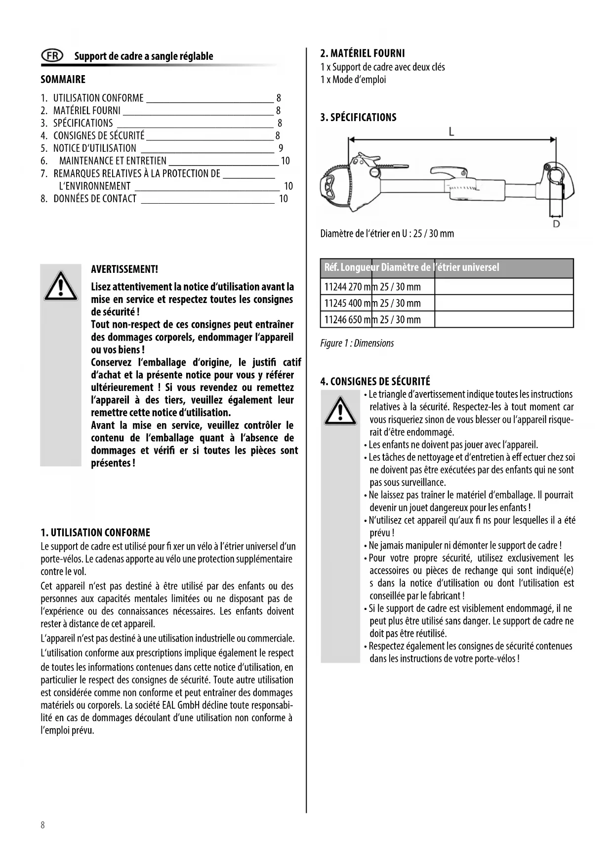 - Respectez également les consignes de sécurité contenues dans les instructions de votre porte-vélos ! Support de cadre a sangle réglable AVERTISSEMENT! Lisez attentivement la notice d‘utilisation avant la mise en service et respectez toutes les consignes de sécurité ! Tout non-respect de ces consignes peut entraîner des dommages corporels, endommager l‘appareil ou vos biens ! Conservez l‘emballage d‘origine, le justi catif d‘achat et la présente notice pour vous y référer ultérieurement ! Si vous revendez ou remettez l‘appareil à des tiers, veuillez également leur remettre cette notice d‘utilisation. Avant la mise en service, veuillez contrôler le contenu de l‘emballage quant à l‘absence de dommages et véri er si toutes les pièces sont présentes ! Figure 1 : Dimensions Réf. Longueur Diamètre de l’étrier universel 11244 270 mm 25 / 30 mm 11245 400 mm 25 / 30 mm 11246 650 mm 25 / 30 mm Diamètre de l‘étrier en U : 25 / 30 mm9 Si le support de cadre est réglé à 180 °, la fonction de sécurité de la serrure n‘est plus assurée. N‘utilisez donc le support de cadre qu‘avec un „léger pliage“.