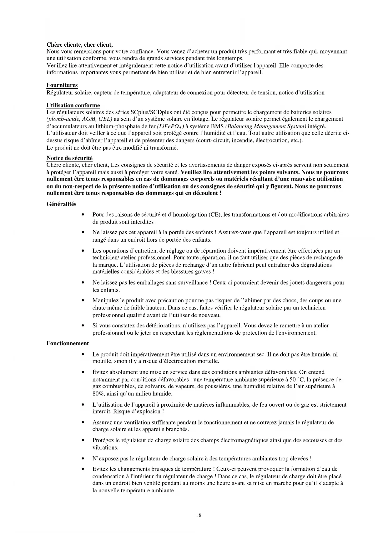 Chère cliente, cher client, Nous vous remercions pour votre confiance. Vous venez d’acheter un produit très performant et très fiable qui, moyennant une utilisation conforme, vous rendra de grands services pendant très longtemps. Veuillez lire attentivement et intégralement cette notice d’utilisation avant d’utiliser l'appareil. Elle comporte des informations importantes vous permettant de bien utiliser et de bien entretenir l’appareil. Fournitures Régulateur solaire, capteur de température, adaptateur de connexion pour détecteur de tension, notice d’utilisation Utilisation conforme Les régulateurs solaires des séries SCplus/SCDplus ont été conçus pour permettre le chargement de batteries solaires (plomb-acide, AGM, GEL) au sein d’un système solaire en îlotage. Le régulateur solaire permet également le chargement d’accumulateurs au lithium-phosphate de fer (LiFePO