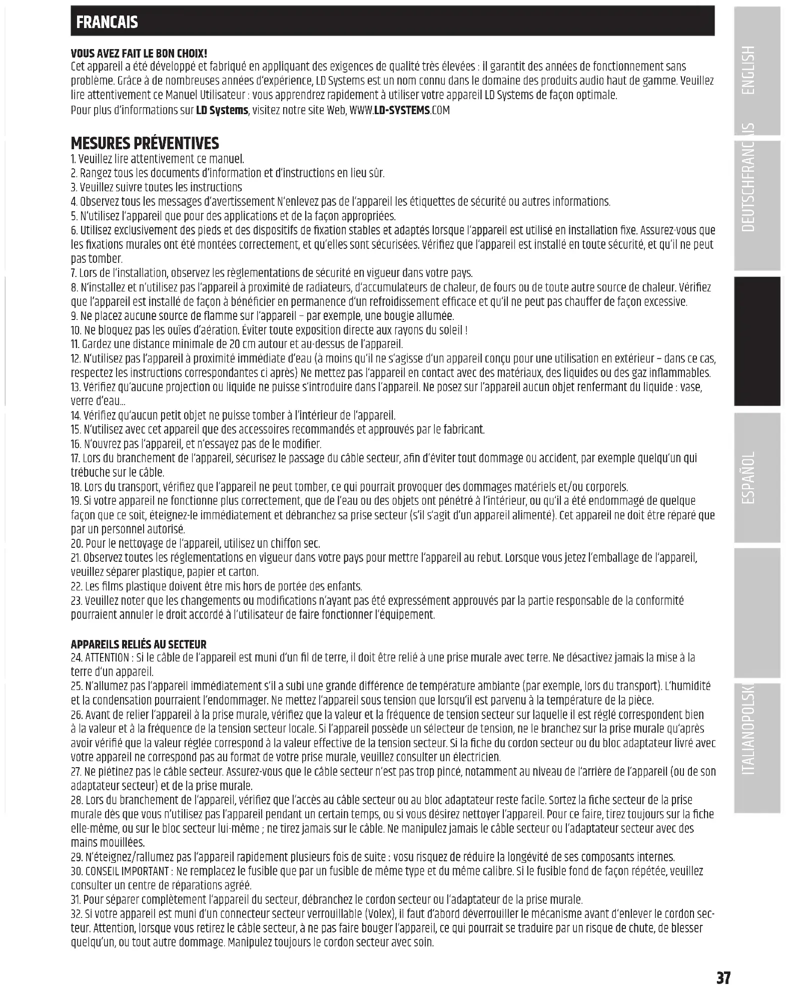 ITALIANO POLSKI ESPAÑOL FRANCAIS DEUTSCHENGLISHFRANCAIS VOUS AVEZ FAIT LE BON CHOIX! Cet appareil a été développé et fabriqué en appliquant des exigences de qualité très élevées : il garantit des années de fonctionnement sans problème. Grâce à de nombreuses années d‘expérience, LD Systems est un nom connu dans le domaine des produits audio haut de gamme. Veuillez lire attentivement ce Manuel Utilisateur : vous apprendrez rapidement à utiliser votre appareil LD Systems de façon optimale. Pour plus d‘informations sur LD Systems, visitez notre site Web, WWW.LD-SYSTEMS.COM