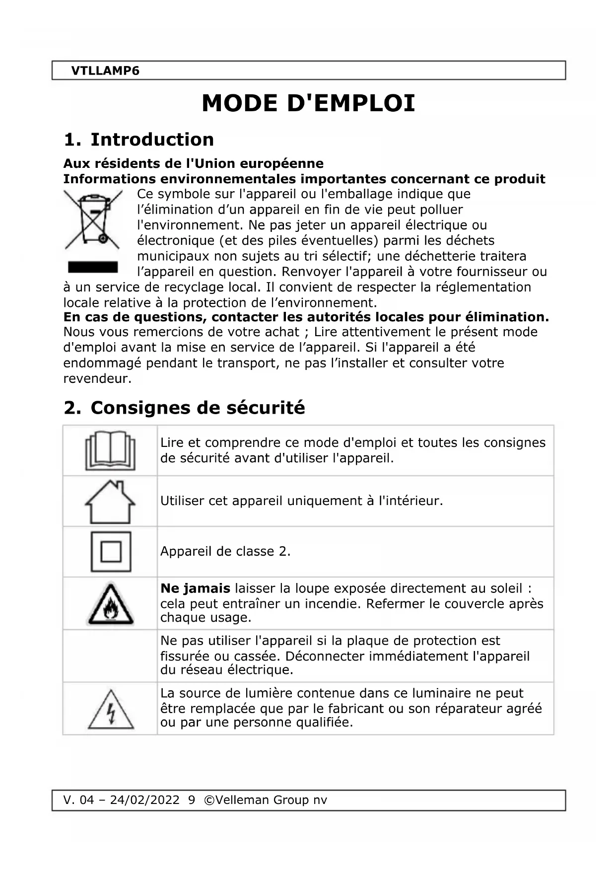 Retrouvez gratuitement la notice de l'appareil VTLLAMP6 VELLEMAN au format PDF.