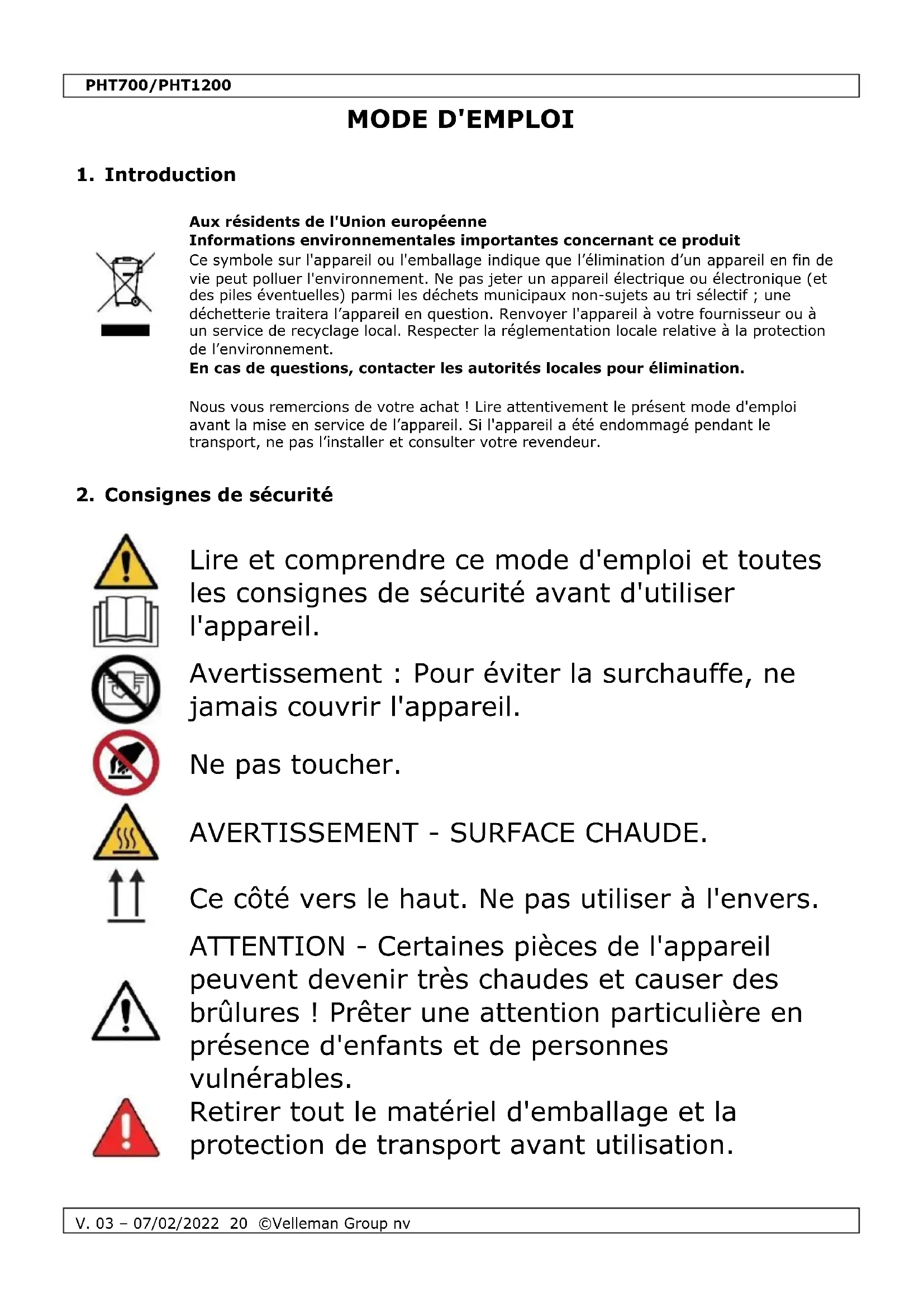 Velleman Group nv est l’ayant droit des droits d’auteur de ce mode d'emploi. Tous droits mondiaux réservés. Toute reproduction, traduction, copie ou diffusion, intégrale ou partielle, du contenu de ce mode d'emploi par quelque procédé ou sur tout support électronique que ce soit est interdite sans l’accord préalable écrit de l’ayant droit.PHT700/PHT1200