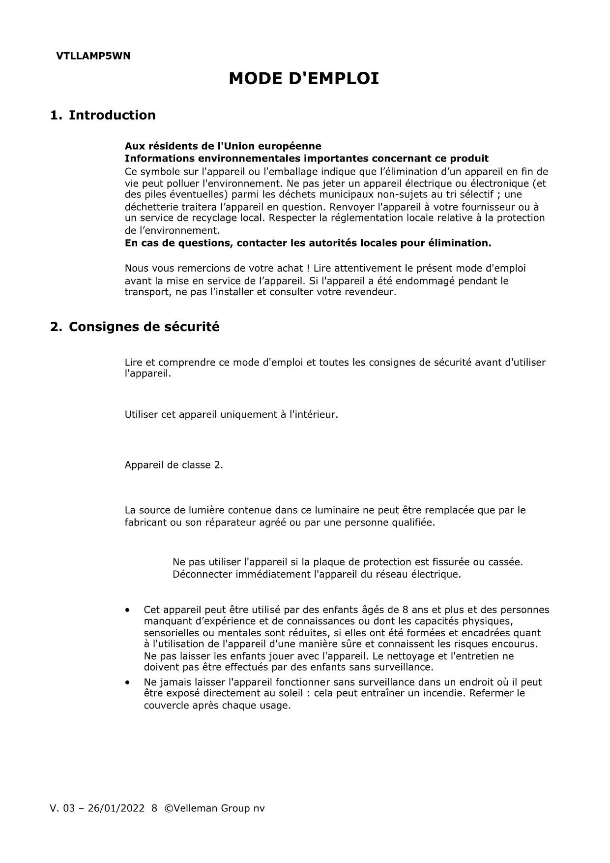 Retrouvez gratuitement la notice de l'appareil VTLLAMP5WN VELLEMAN au format PDF.