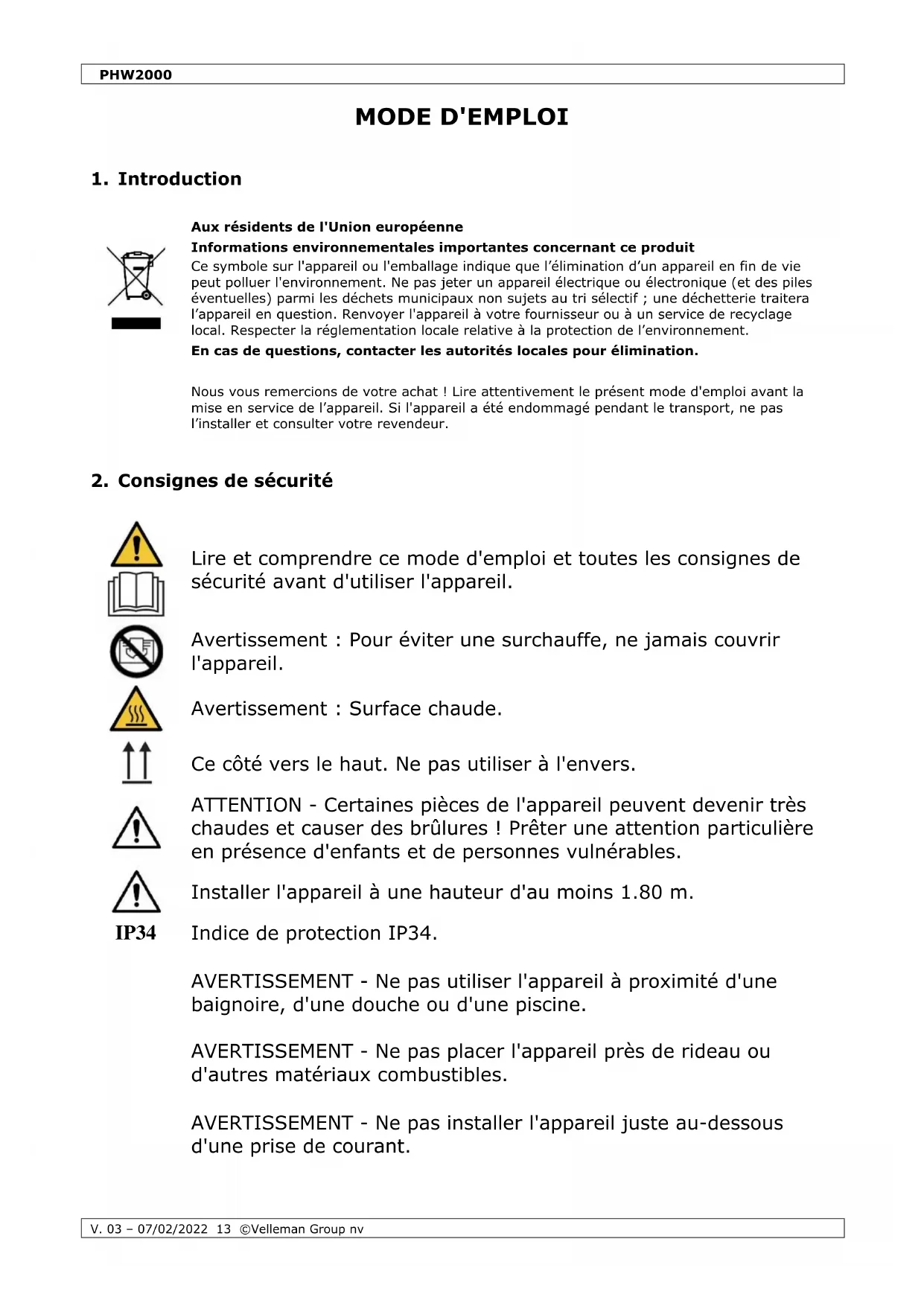 Velleman Group nv est l’ayant droit des droits d’auteur de ce mode d'emploi. Tous droits mondiaux réservés. Toute reproduction, traduction, copie ou diffusion, intégrale ou partielle, du contenu de ce mode d'emploi par quelque procédé ou sur tout support électronique que ce soit est interdite sans l’accord préalable écrit de l’ayant droit.PHW2000