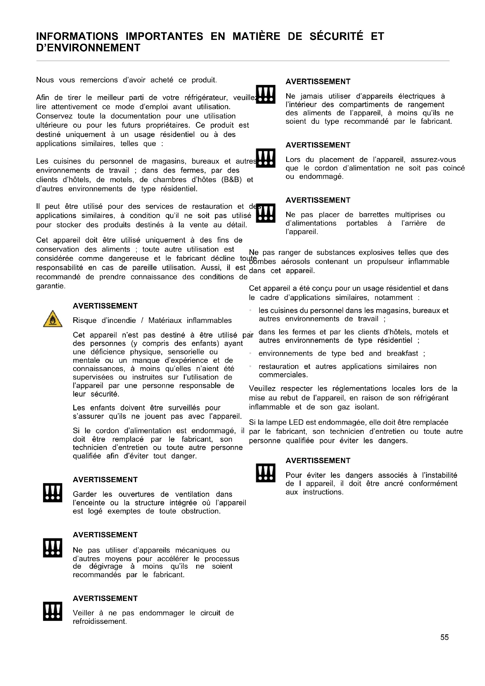 - PRÉCAUTIONS ET ENTRETIEN INFORMATIONS IMPORTANTES EN MATIÈRE DE SÉCURITÉ ET D’ENVIRONNEMENT Nous vous remercions d’avoir acheté ce produit. Afin de tirer le meilleur parti de votre réfrigérateur, veuillez lire attentivement ce mode d’emploi avant utilisation. Conservez toute la documentation pour une utilisation ultérieure ou pour les futurs propriétaires. Ce produit est destiné uniquement à un usage résidentiel ou à des applications similaires, telles que : Les cuisines du personnel de magasins, bureaux et autres environnements de travail ; dans des fermes, par des clients d’hôtels, de motels, de chambres d’hôtes (B&B) et d’autres environnements de type résidentiel. Il peut être utilisé pour des services de restauration et des applications similaires, à condition qu’il ne soit pas utilisé pour stocker des produits destinés à la vente au détail. Cet appareil doit être utilisé uniquement à des fins de conservation des aliments ; toute autre utilisation est considérée comme dangereuse et le fabricant décline toute responsabilité en cas de pareille utilisation. Aussi, il est recommandé de prendre connaissance des conditions de garantie. AVERTISSEMENT Risque d’incendie / Matériaux inflammables Cet appareil n’est pas destiné à être utilisé par des personnes (y compris des enfants) ayant une déficience physique, sensorielle ou mentale ou un manque d’expérience et de connaissances, à moins qu’elles n’aient été supervisées ou instruites sur l’utilisation de l’appareil par une personne responsable de leur sécurité. Les enfants doivent être surveillés pour s’assurer qu’ils ne jouent pas avec l’appareil. Si le cordon d’alimentation est endommagé, il doit être remplacé par le fabricant, son technicien d’entretien ou toute autre personne qualifiée afin d’éviter tout danger. AVERTISSEMENT Garder les ouvertures de ventilation dans l’enceinte ou la structure intégrée où l’appareil est logé exemptes de toute obstruction. AVERTISSEMENT Ne pas utiliser d’appareils mécaniques ou d’autres moyens pour accélérer le processus de dégivrage à moins qu’ils ne soient recommandés par le fabricant. AVERTISSEMENT Veiller à ne pas endommager le circuit de refroidissement. AVERTISSEMENT Ne jamais utiliser d’appareils électriques à l’intérieur des compartiments de rangement des aliments de l’appareil, à moins qu’ils ne soient du type recommandé par le fabricant. AVERTISSEMENT Lors du placement de l’appareil, assurez-vous que le cordon d’alimentation ne soit pas coincé ou endommagé. AVERTISSEMENT Ne pas placer de barrettes multiprises ou d’alimentations portables à l’arrière de l’appareil. Ne pas ranger de substances explosives telles que des bombes aérosols contenant un propulseur inflammable dans cet appareil. Cet appareil a été conçu pour un usage résidentiel et dans le cadre d’applications similaires, notamment : p. 73