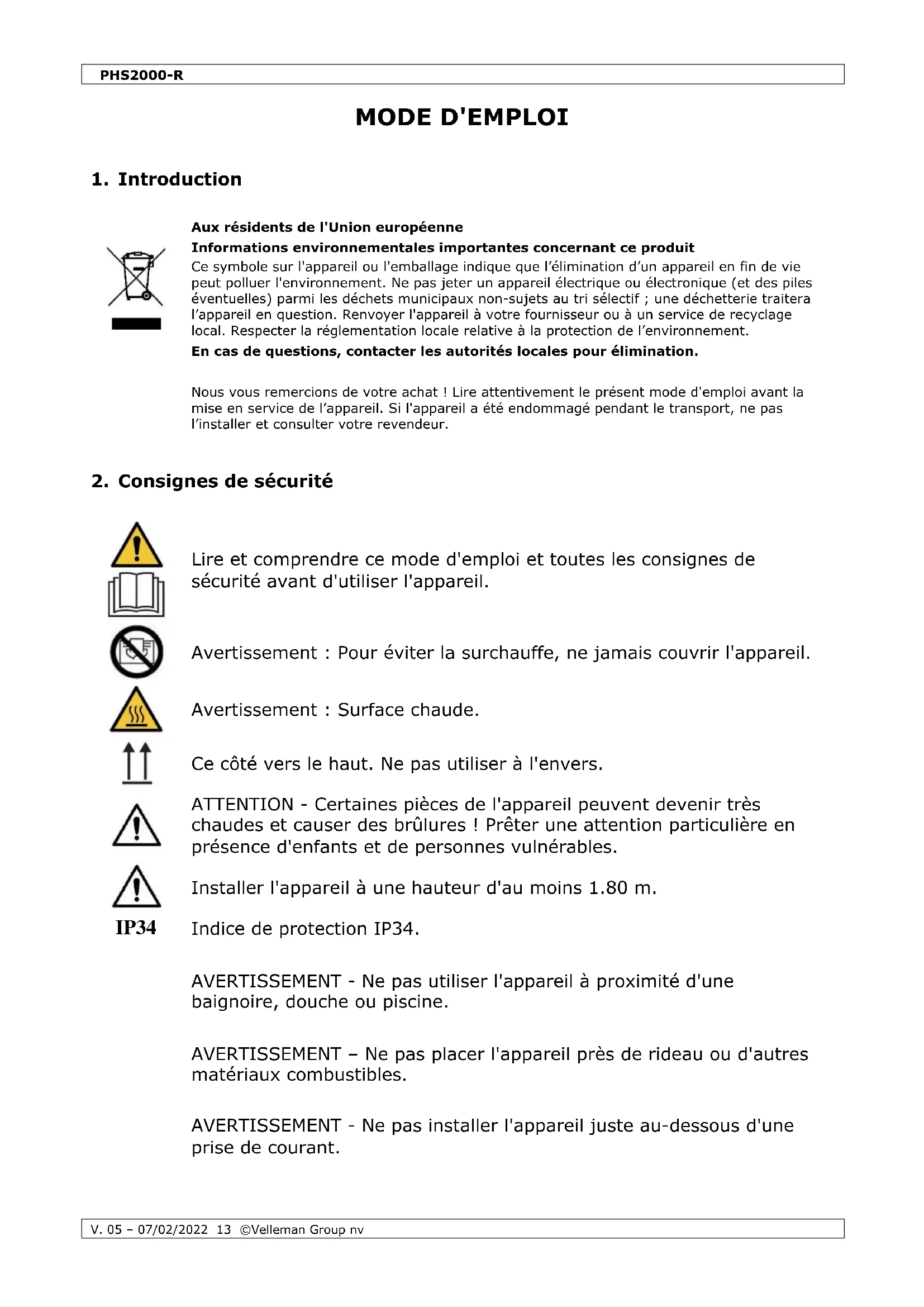 Velleman Group nv est l’ayant droit des droits d’auteur de ce mode d'emploi. Tous droits mondiaux réservés. Toute reproduction, traduction, copie ou diffusion, intégrale ou partielle, du contenu de ce mode d'emploi par quelque procédé ou sur tout support électronique que ce soit est interdite sans l’accord préalable écrit de l’ayant droit.PHS2000-R