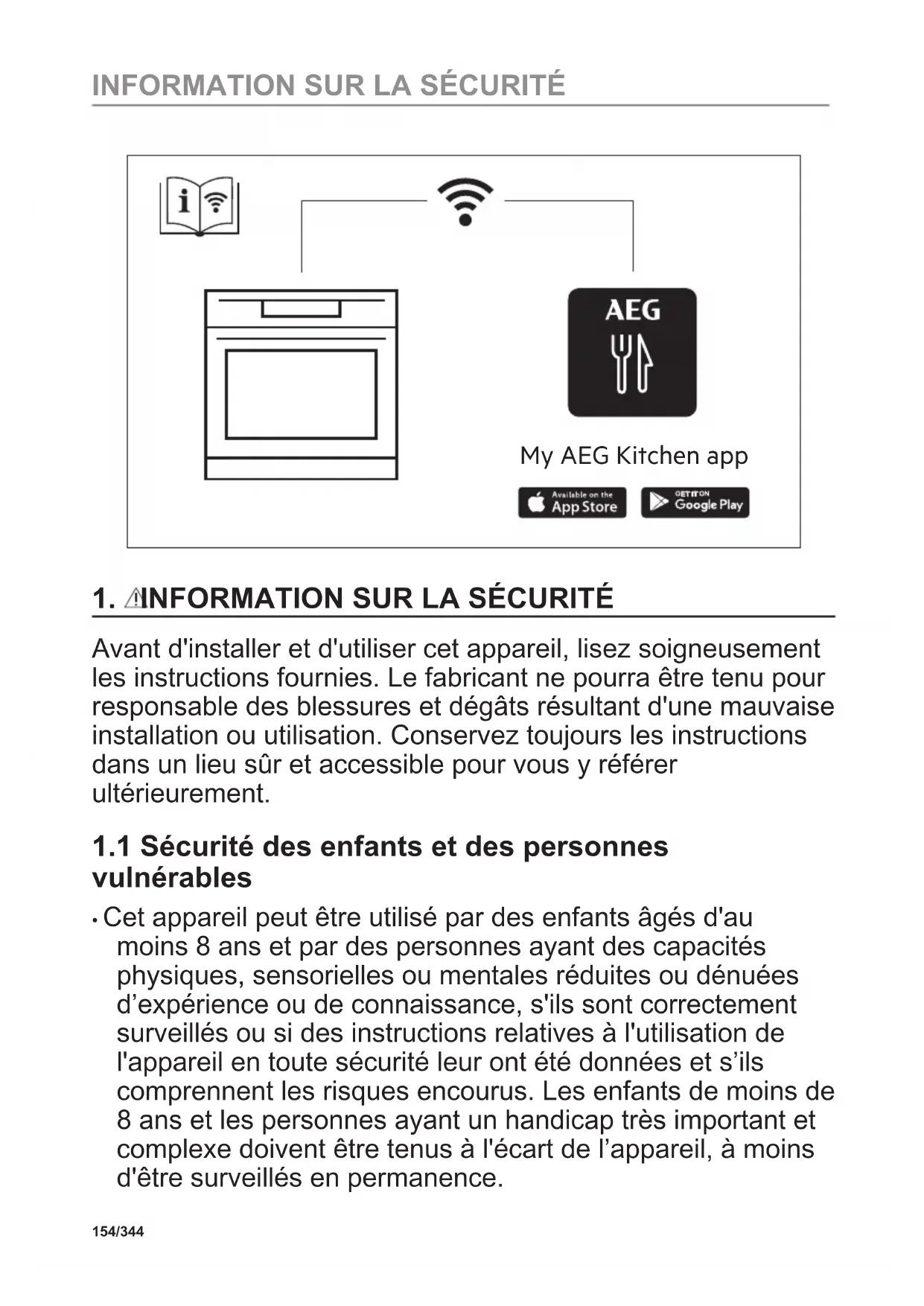 - Cet appareil peut être utilisé par des enfants âgés d'au moins 8 ans et par des personnes ayant des capacités physiques, sensorielles ou mentales réduites ou dénuées d’expérience ou de connaissance, s'ils sont correctement surveillés ou si des instructions relatives à l'utilisation de l'appareil en toute sécurité leur ont été données et s’ils comprennent les risques encourus. Les enfants de moins de 8 ans et les personnes ayant un handicap très important et complexe doivent être tenus à l'écart de l’appareil, à moins d'être surveillés en permanence. 154/344 INFORMATION SUR LA SÉCURITÉ• Veillez à ce que les enfants ne jouent pas avec l’appareil et les appareils mobiles avec My AEG Kitchen .